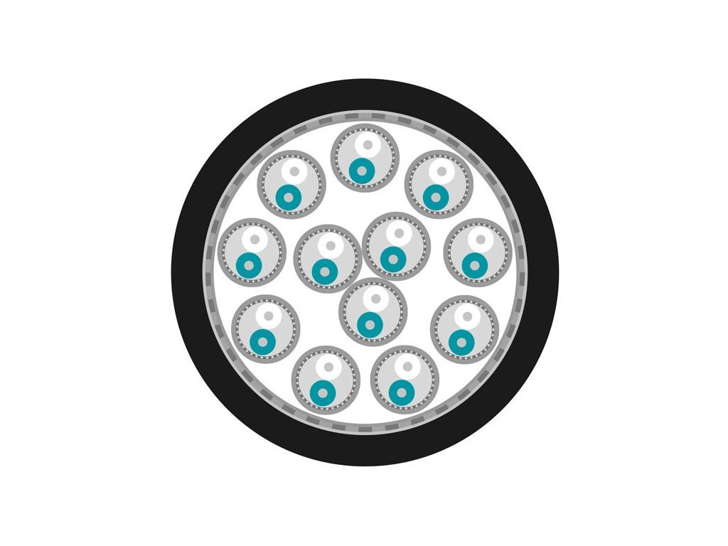 Kabel wieloparowy, 12 par przewodów ekranowanych oddzielnie posrebrzaną miedzianą plecionką i izolacją PVC z numeracją + całkowite ekranowanie kabla posrebrzaną miedzianą plecionką.