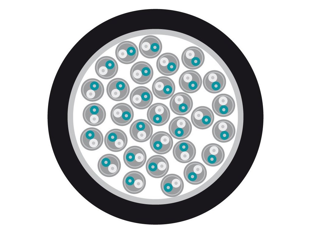 Kabel wieloparowy, 32 pary przewodów ekranowanych oddzielnie posrebrzaną miedzianą plecionką i izolacją PVC z numeracją + całkowite ekranowanie kabla posrebrzaną miedzianą plecionką.