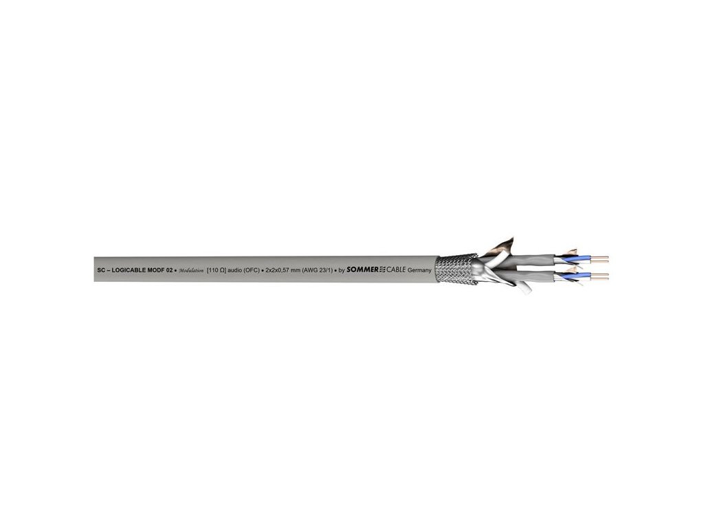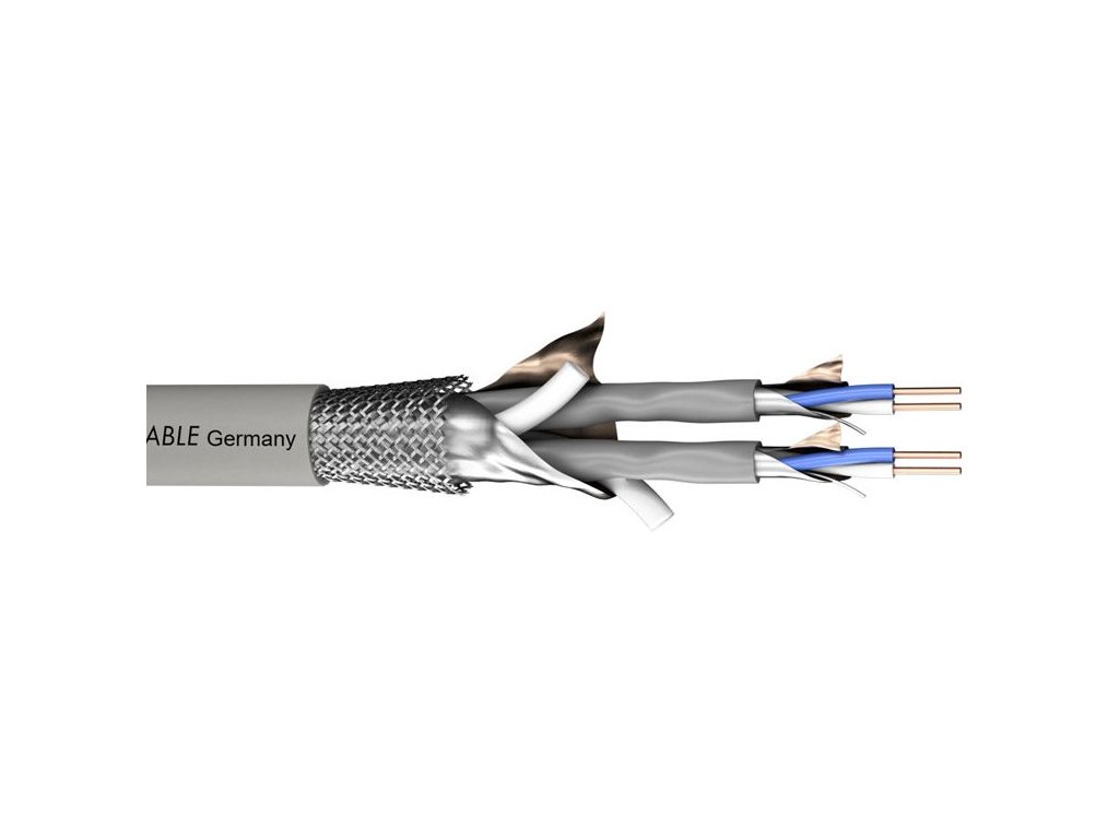 Kabel wieloparowy LOGIC AES EBU. Zastosowanie w instalacjach stałych. Bezhalogenowa wysokiej jakości miedź OFC i niepalna powłoka FRNC, odpowiednia do analogowej i cyfrowej transmisji sygnału audio. 2 oddzielne pary przewodów o przekroju drutu stałego 2 x 0,57 mm² i 100% posrebrzane ekranowanie oplotem i folią aluminiową, przewody są oddzielnie ponumerowane. Całkowita średnica powłoki FRNC 9 mm, pojemność przewodów na 1 m 43 pF, pojemność ekranowania na 1 m 82 pF, impedancja 110 Ohm, masa 1 m 95 g, kolor szary.