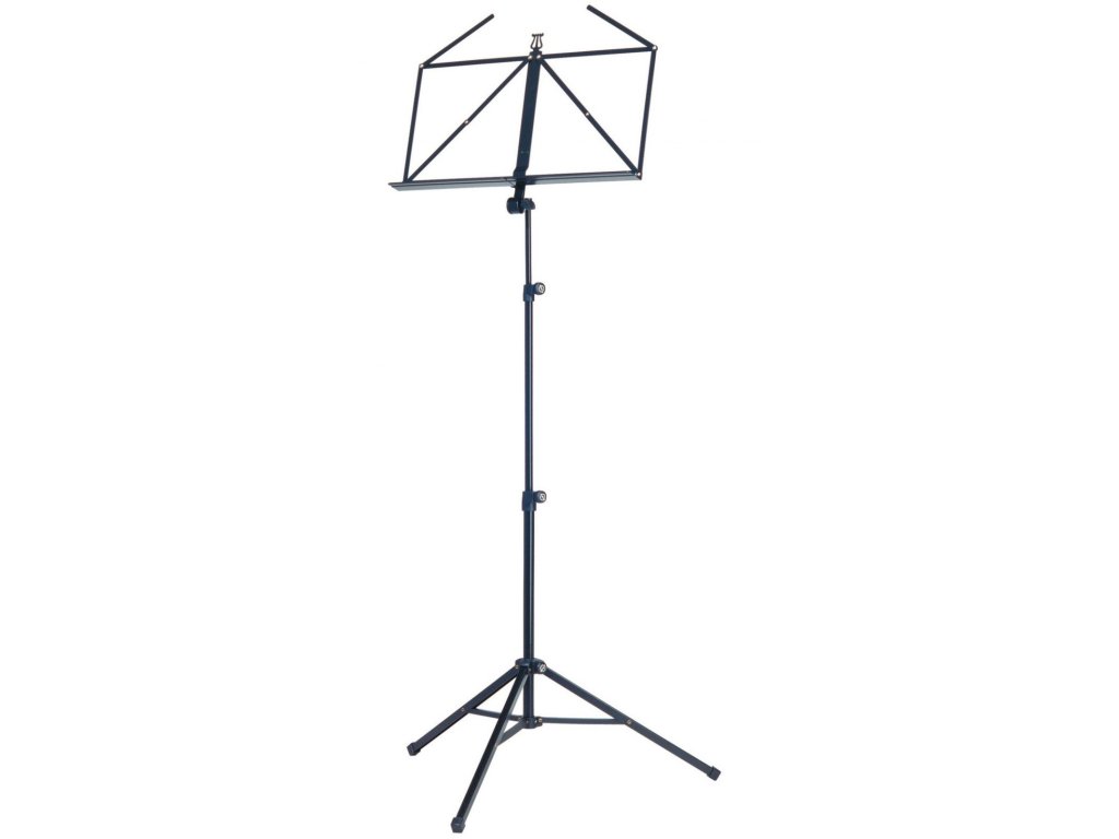 Składany pulpit do nut z dużą, głęboką płytą. Wysokość statywu 585/1220 mm. Wymiary płyty 485 x 240 x 42 mm. Produkowany w kolorze czarnym i niklowanym.