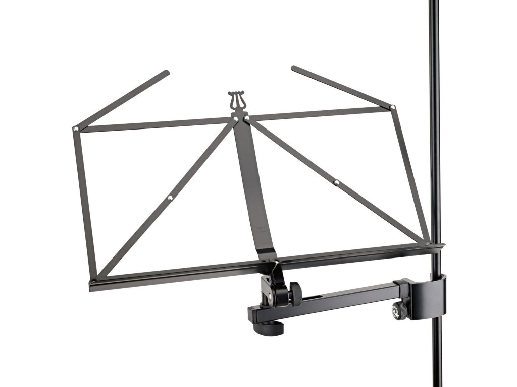 Składany pulpit do nut/uchwyt do mocowania na statywie mikrofonowym o średnicy 11 - 30 mm. Mocowanie za pomocą regulowanego ramienia o zakresie 185 - 265 mm. Wymiary płyty 485 x 240 x 42 mm. Produkowany w kolorze czarnym.