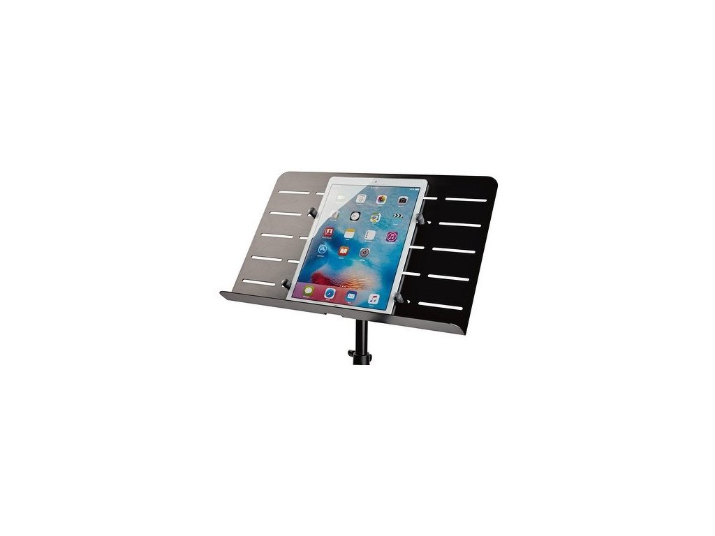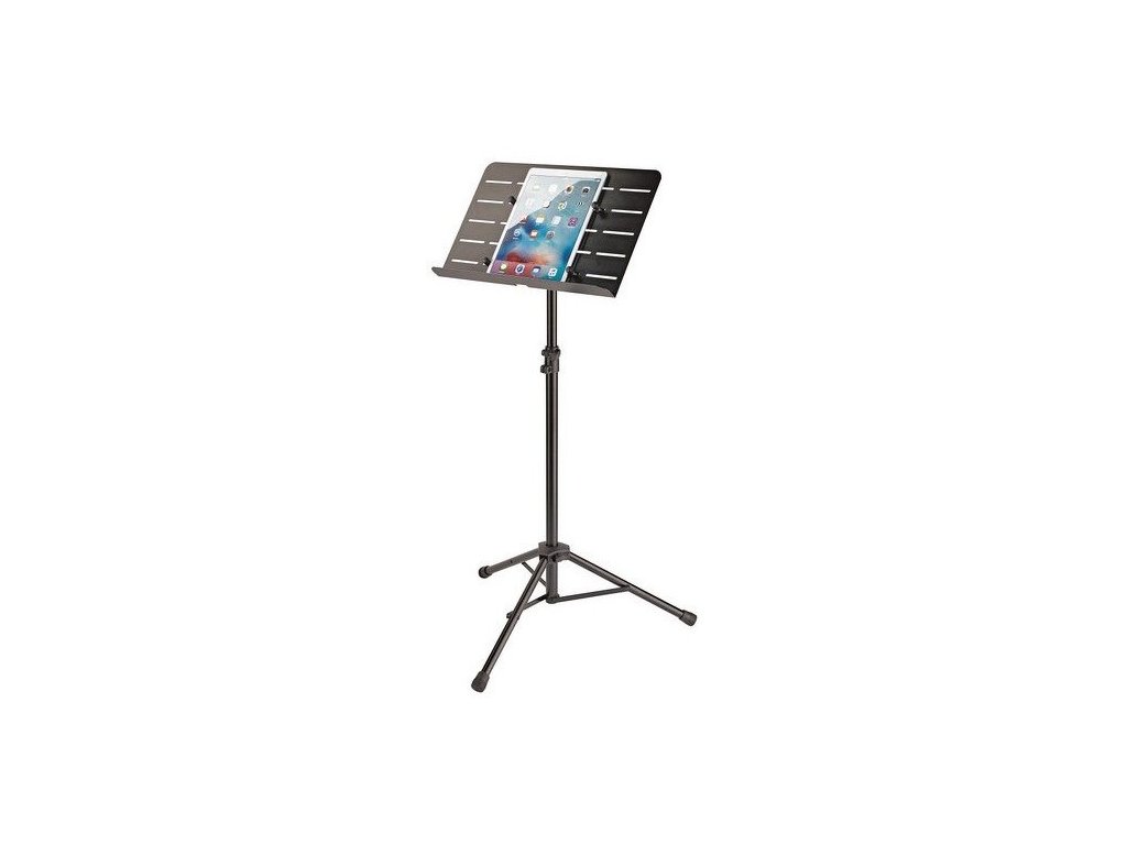 Stalowy pulpit do nut z uchwytem na tablet. Łatwo zdejmowana płyta z możliwością regulacji kąta nachylenia. Gumowane śruby mocujące do bezpiecznego umieszczenia tabletu. Wysokość 750/1350 mm. Wymiary płyty 495 x 320 x 50 mm. Produkowany w kolorze czarnym.