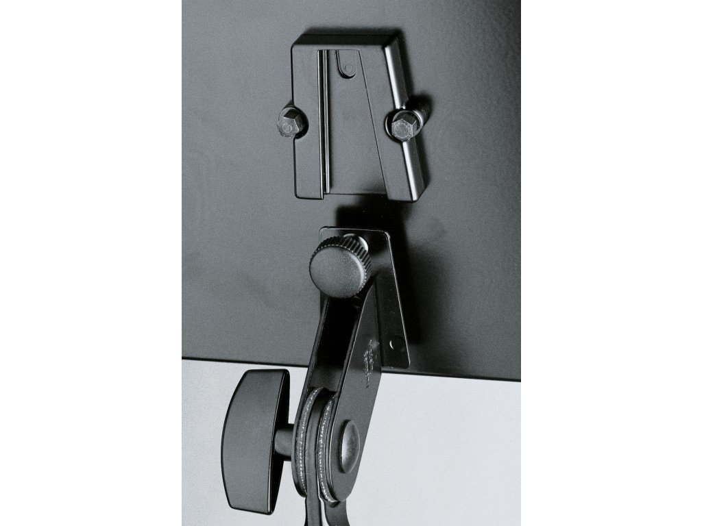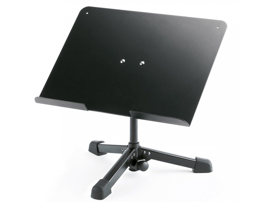 Uniwersalny stojak stołowy do notebooka, tabletu lub innych urządzeń multimedialnych, nut, książek itp. Wysokość stojaka 240 mm. Wymiary płyty 350 x 273 mm. Stojak ma składane nogi. Łatwe mocowanie płyty za pomocą złącza V blok. Produkowany w kolorze czarnym.