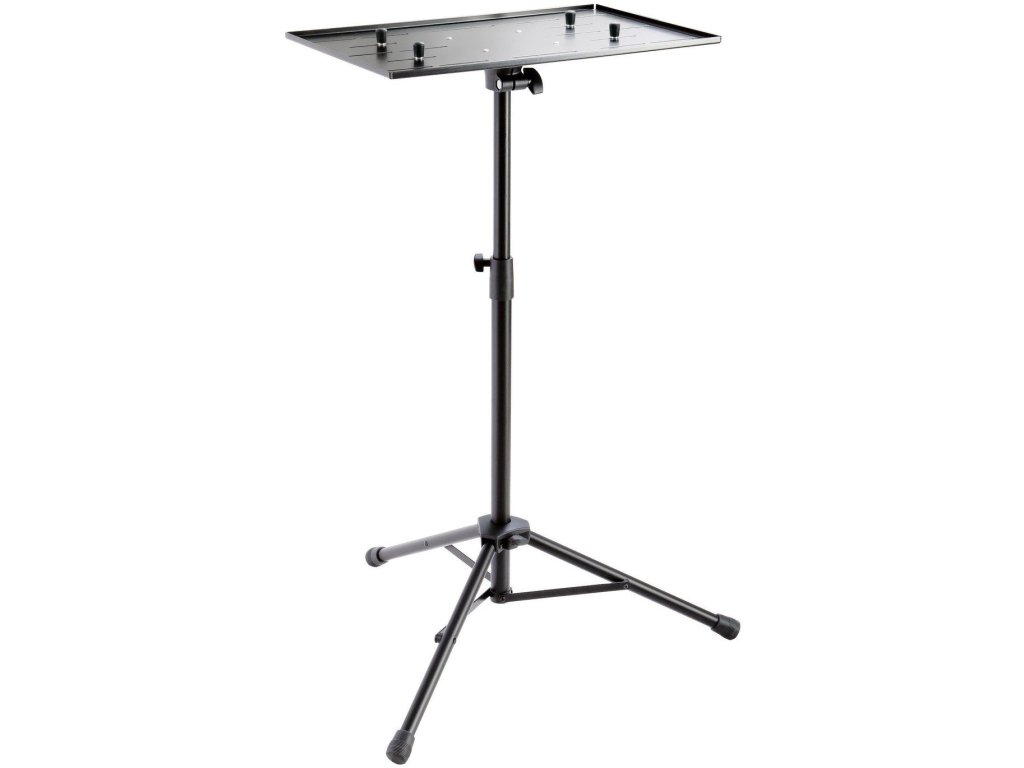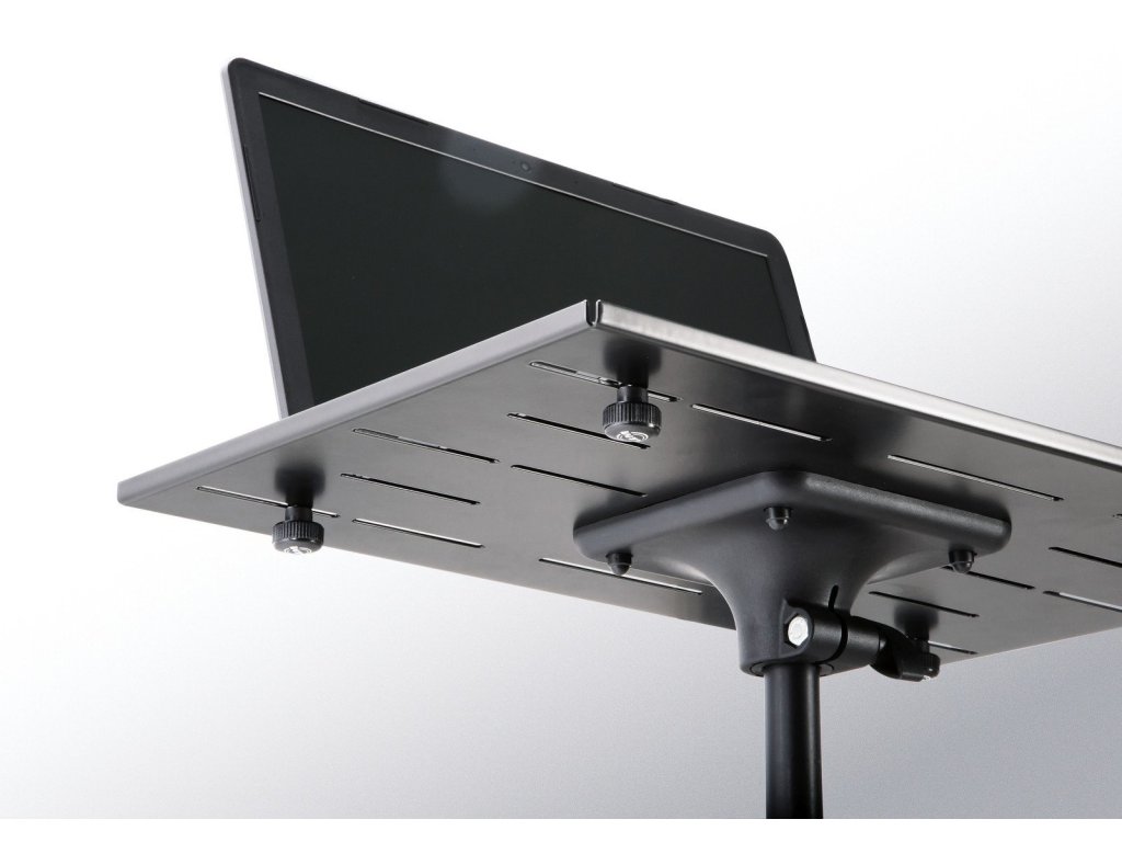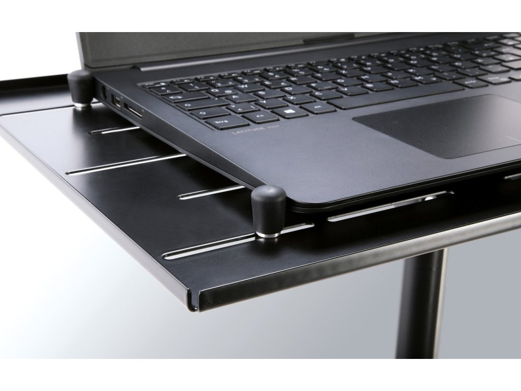 Stabilny, trójnożny stojak na laptopa. Wymiary blatu 479 x 312 mm. Wysokość 700/1250 mm. Laptop jest mocno zamocowany za pomocą regulowanych śrub mocujących z gumowymi nakładkami. Do transportu blat można łatwo zdjąć bez użycia narzędzi, a nogi złożyć do kompaktowego, łatwego do przenoszenia opakowania. Produkowany w kolorze czarnym.