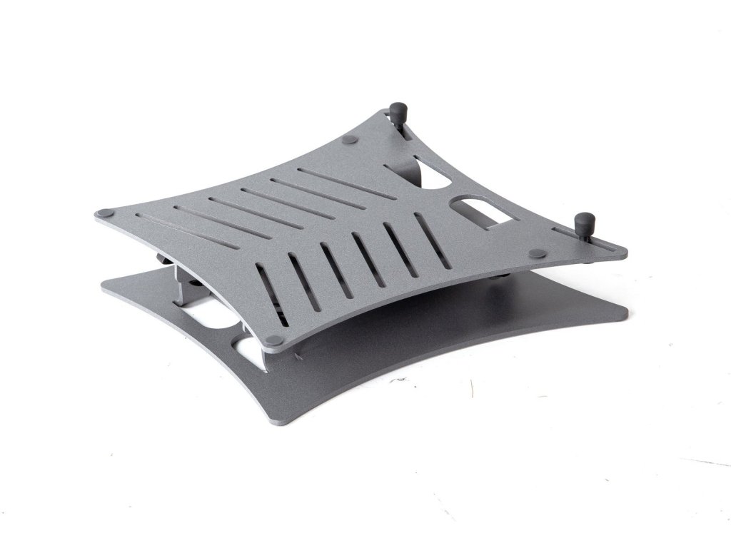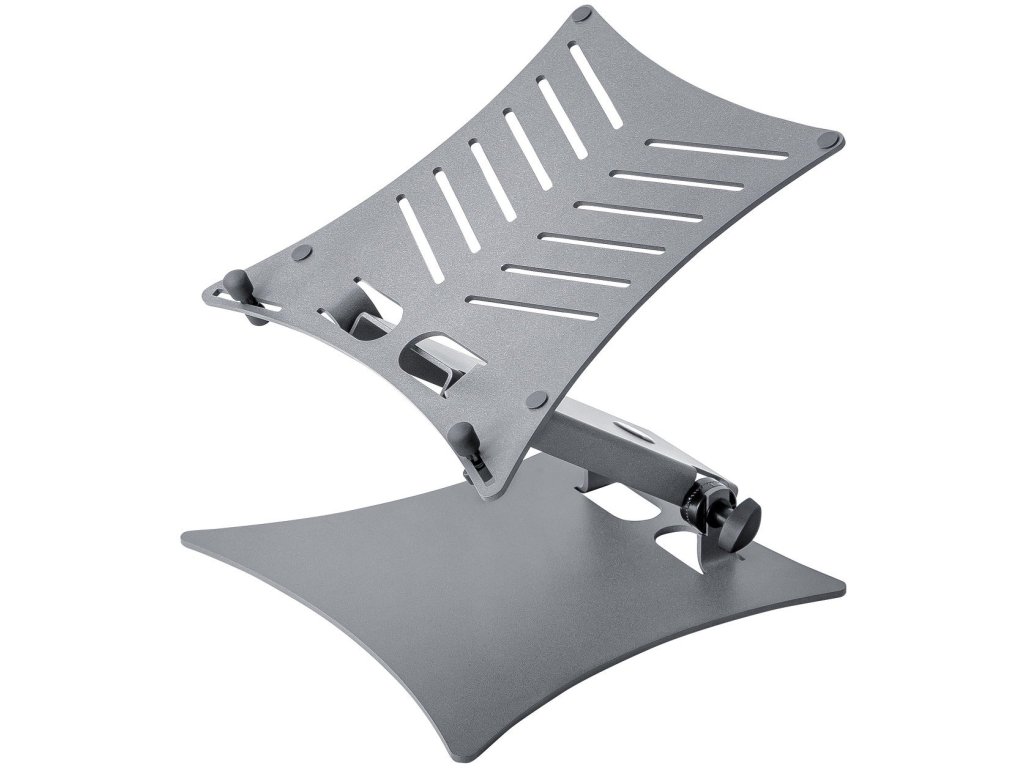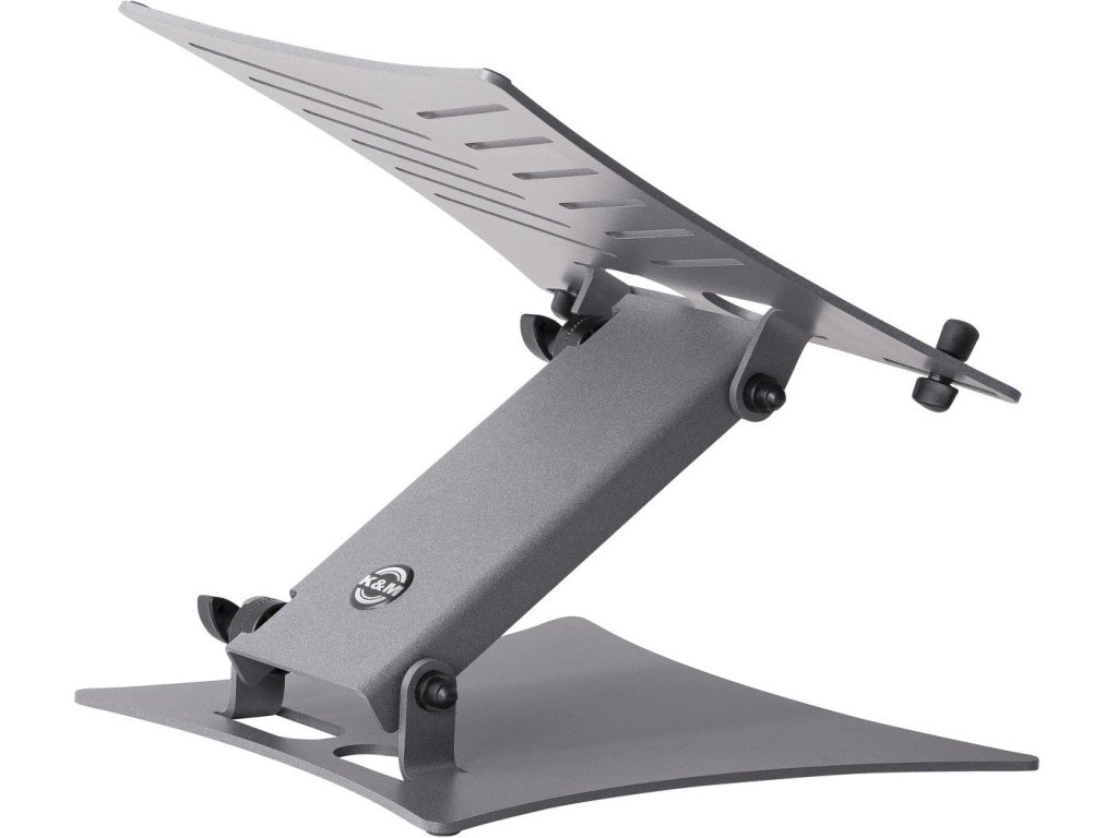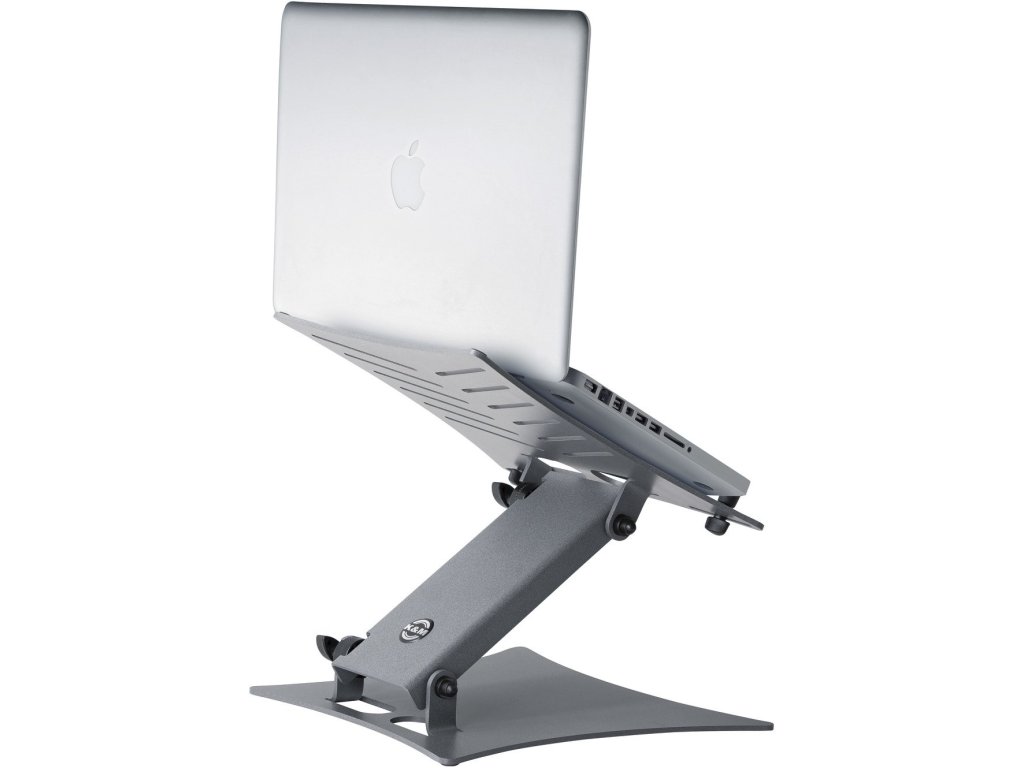 Uniwersalny stojak na notebook z powierzchnią pokrytą wysokiej jakości szarym lakierem proszkowym. Stalowa płyta podstawy zapewnia stabilność stojaka. Aluminiowa płyta nośna i ramię pozycjonujące gwarantują niską wagę. Stojak jest odpowiednim narzędziem dla DJ-ów i muzyków. Indywidualnie regulowane kołki z gumowymi nakładkami umożliwiają korzystanie ze wszystkich popularnych modeli notebooków, tabletów, mikserów i odtwarzaczy CD. Stojak ma antypoślizgowe gumowe nóżki. Wysokość 65 - 265 mm. Nośność 8 kg. Wymiary do umieszczenia notebooka 250 x 303 mm.