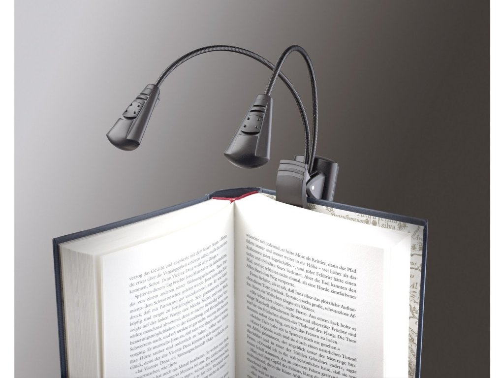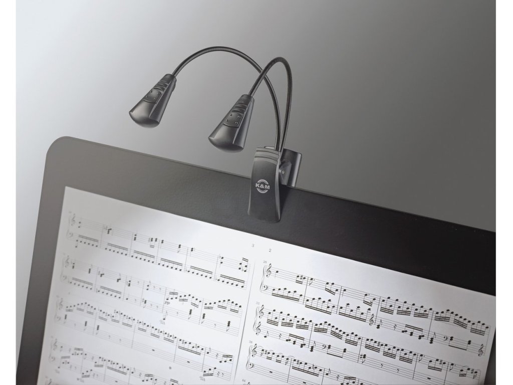 Kompaktowa i wszechstronna lampka »Double LED FlexLight« z dwoma oddzielnymi światłami LED na gęsiej szyi. Światła LED można włączać indywidualnie, mają żywotność 100 000 godzin. Praktyczny i wyjątkowo szeroki klips (do 25 mm) mocuje się do pulpitu na nuty lub np. do książki czy blatu stołu. Może być również używana jako lampa stojąca. Gęsie szyje są kompaktowe i łatwe w obsłudze. Zawiera 3 baterie (1,5 V AAA). Żywotność baterii do 20 godzin.