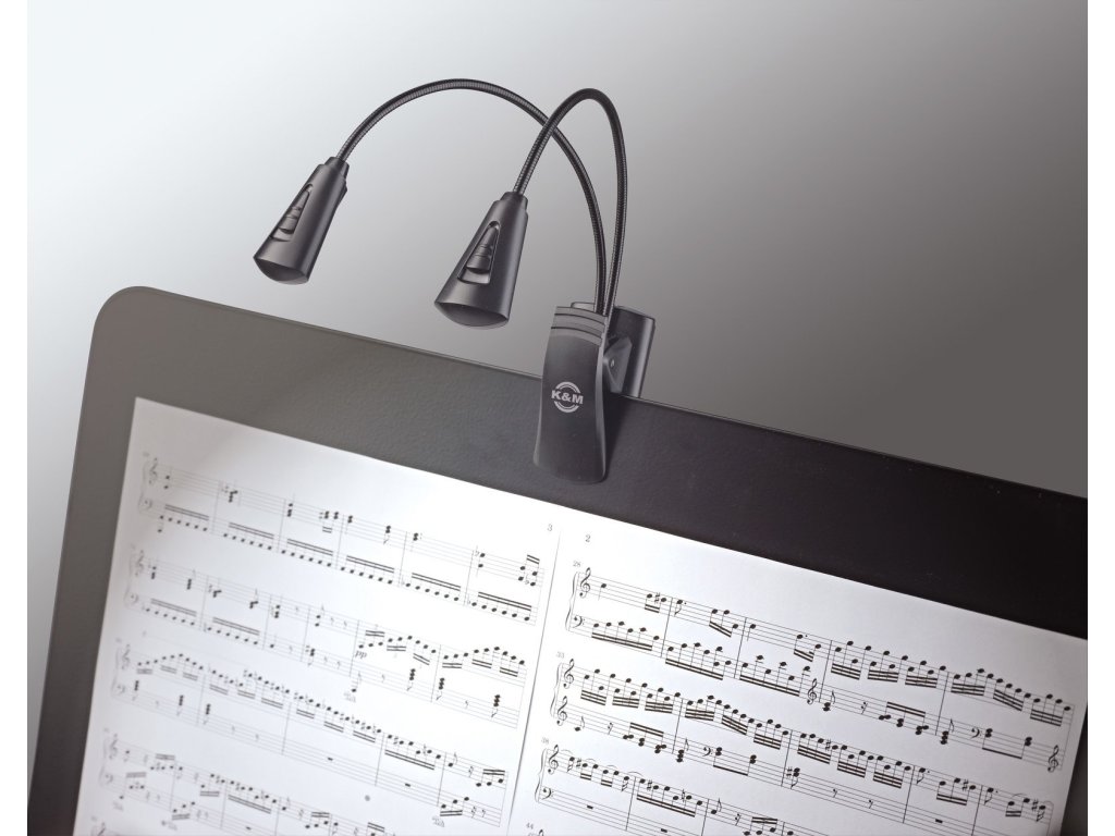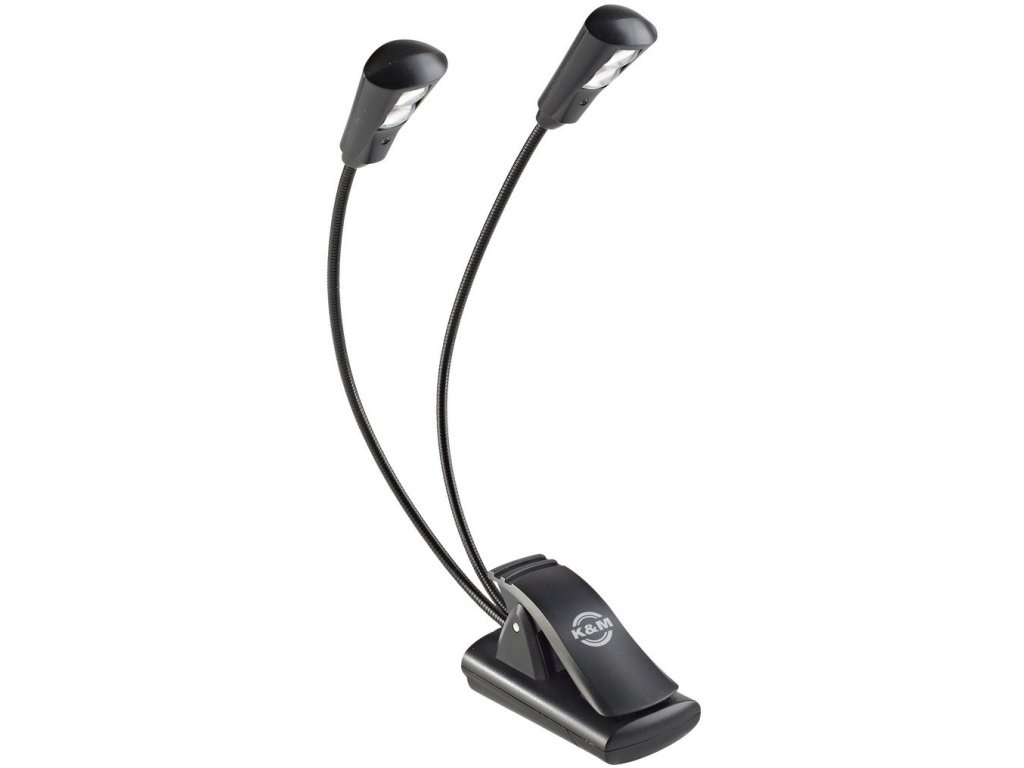Kompaktowa i wszechstronna lampka »Double 2LED FlexLight« z dwoma oddzielnymi, giętkimi ramionami i dwiema wytrzymałymi diodami LED na każdym giętkim ramieniu. Energooszczędne diody LED mają żywotność około 100 000 godzin. Praktyczny i wyjątkowo szeroki klips (do 25 mm) mocuje się do pulpitów na nuty/stojaków, blatów stołów itp. Może być również używana jako lampa stojąca. Zasilanie za pomocą 3 baterii (1,5 V AAA) o żywotności baterii do 20 godzin (w zestawie). Lampkę można również zasilać zasilaczem prądu zmiennego (brak w zestawie). Produkowany w kolorze czarnym.
