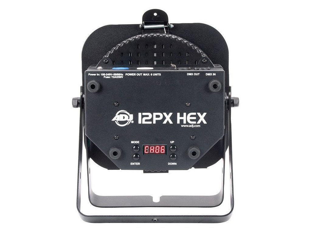 Profesjonalne funkcje 12PX HEX obejmują: 4 tryby DMX (6, 7, 8 i 12 kanałów), 5 trybów pracy, 5 ściemniaczy, brak migotania i 4-przyciskowe menu DMX z cyfrowym wyświetlaczem. Użytkownicy mogą wybierać 3-pinowe lub 5-pinowe złącza DMX.