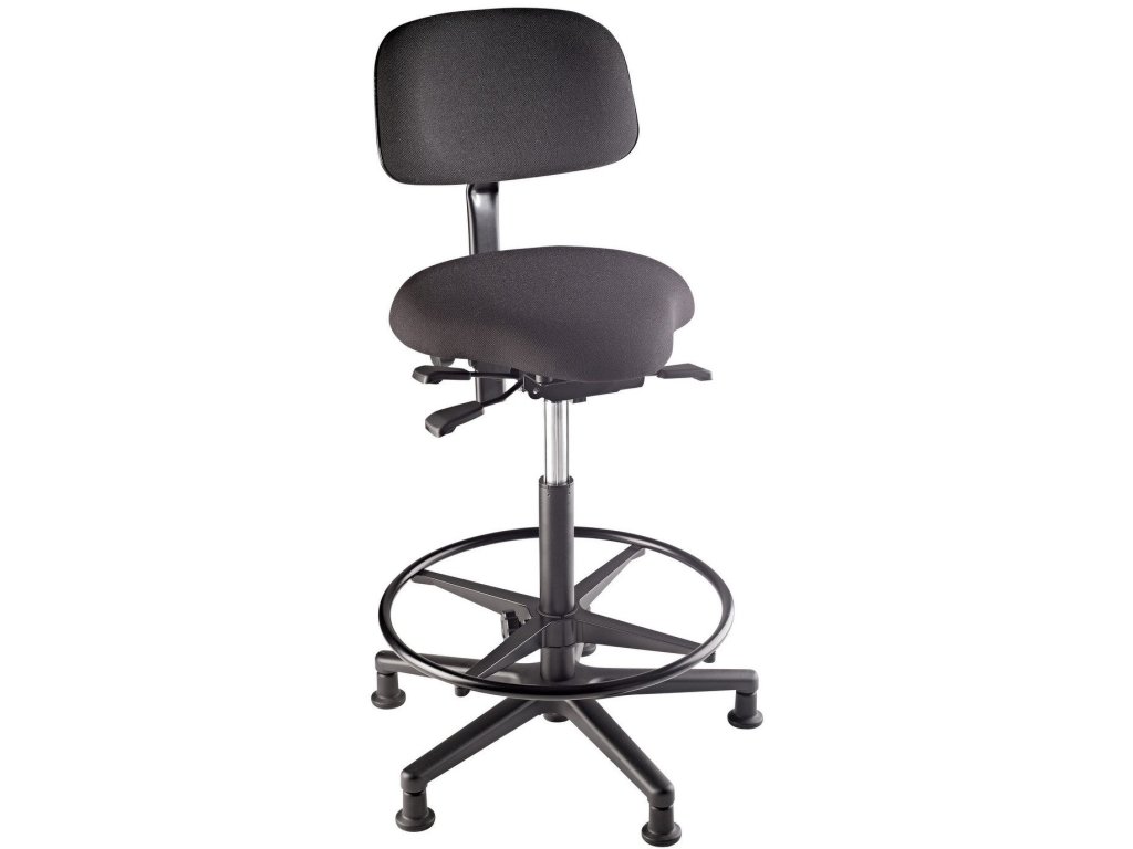 W pełni regulowany stołek basowy z tapicerowanym siedziskiem i oparciem. Wyściółka i tkanina wykonane są z materiałów niepalnych (Trevira CST). Tkanina charakteryzuje się odpornością na ścieranie wynoszącą 100 000 cykli. Regulacja wysokości i kąta nachylenia pneumatycznego siedziska i oparcia. Regulowany na wysokość podnóżek. 5 nóg gwarantuje wysoką stabilność. Produkowany w kolorze czarnym.