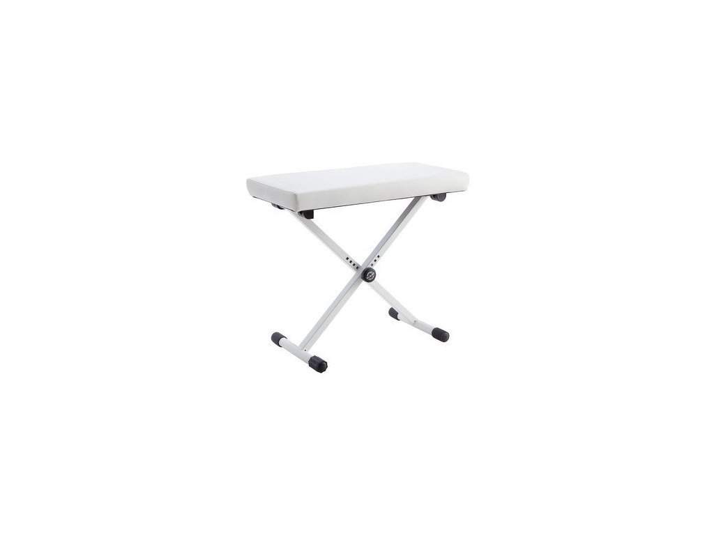 Szeroki stołek dla klawiszowców. Wysokość stołka 405/605 mm. Siedzisko o wymiarach 650 x 300 mm jest pokryte białą skórą ekologiczną. Składana konstrukcja ułatwiająca transport. Produkowany jest w kolorze białym.