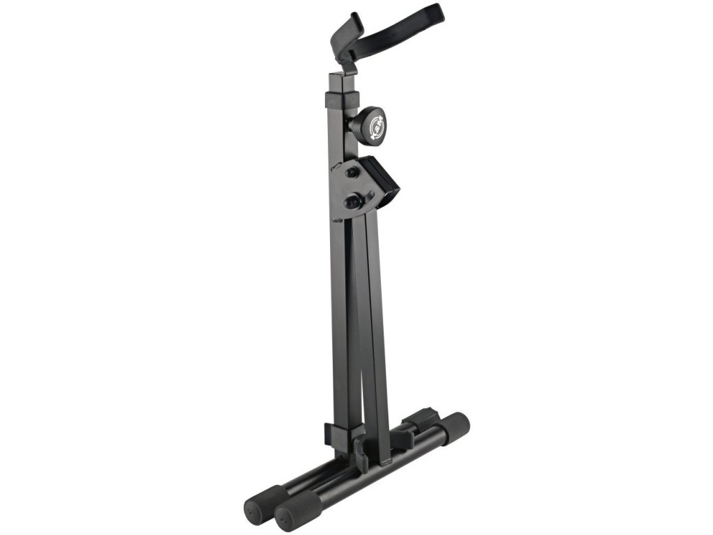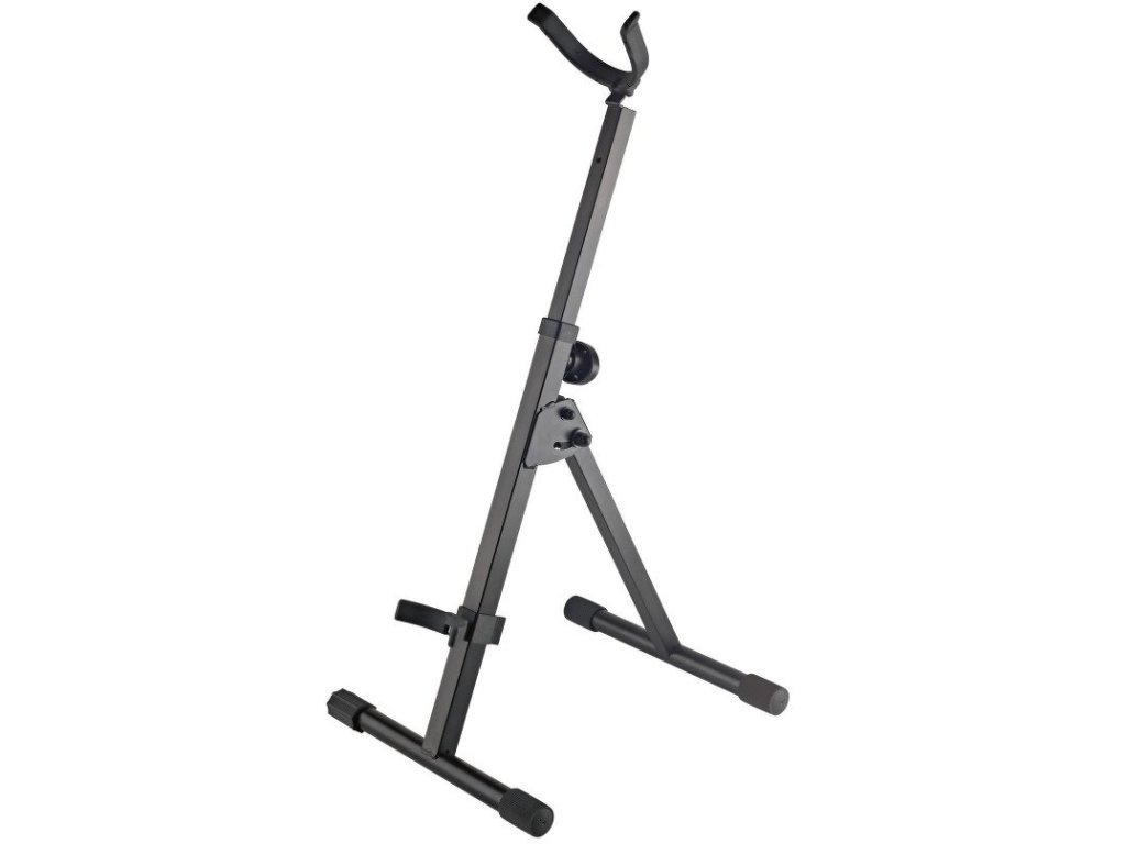 Wyjątkowo stabilny i wytrzymały statyw do saksofonów barytonowych. Masywna metalowa konstrukcja bezpiecznie utrzymuje saksofon na swoim miejscu. Podpórki instrumentu są całkowicie pokryte gumą i chronią instrument przed zarysowaniami. Wysokość statywu można regulować w 12 pozycjach w zakresie 650/920 mm. Produkowany w kolorze czarnym.
