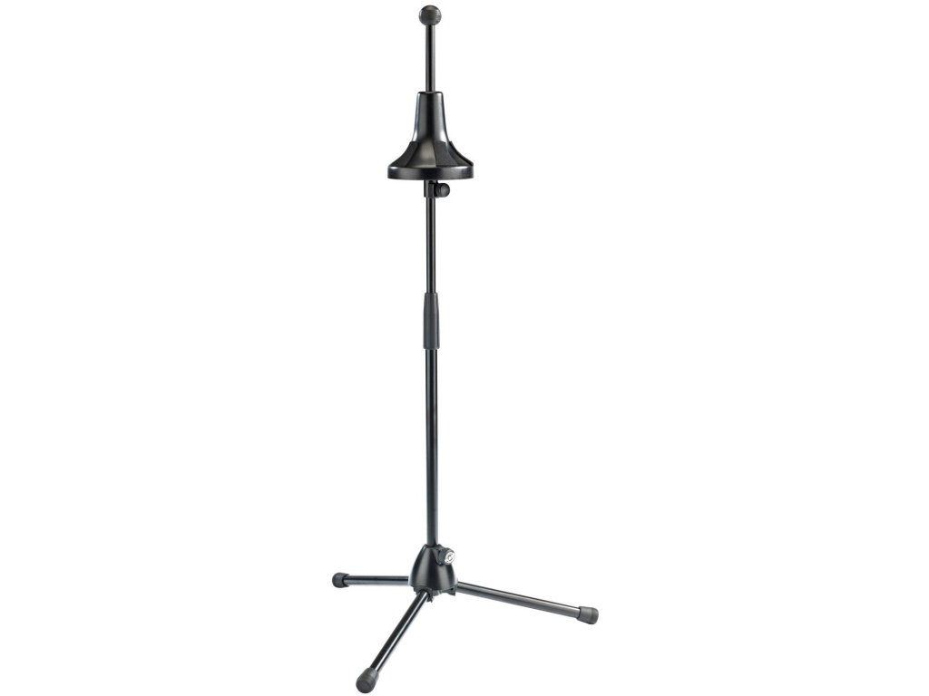 Solidny, wysuwany, stalowy statyw na puzon basowy. Drewniany kołek z filcowymi podkładkami. Składane nogi. Wysokość 650/1140 mm. Produkowany w kolorze czarnym.