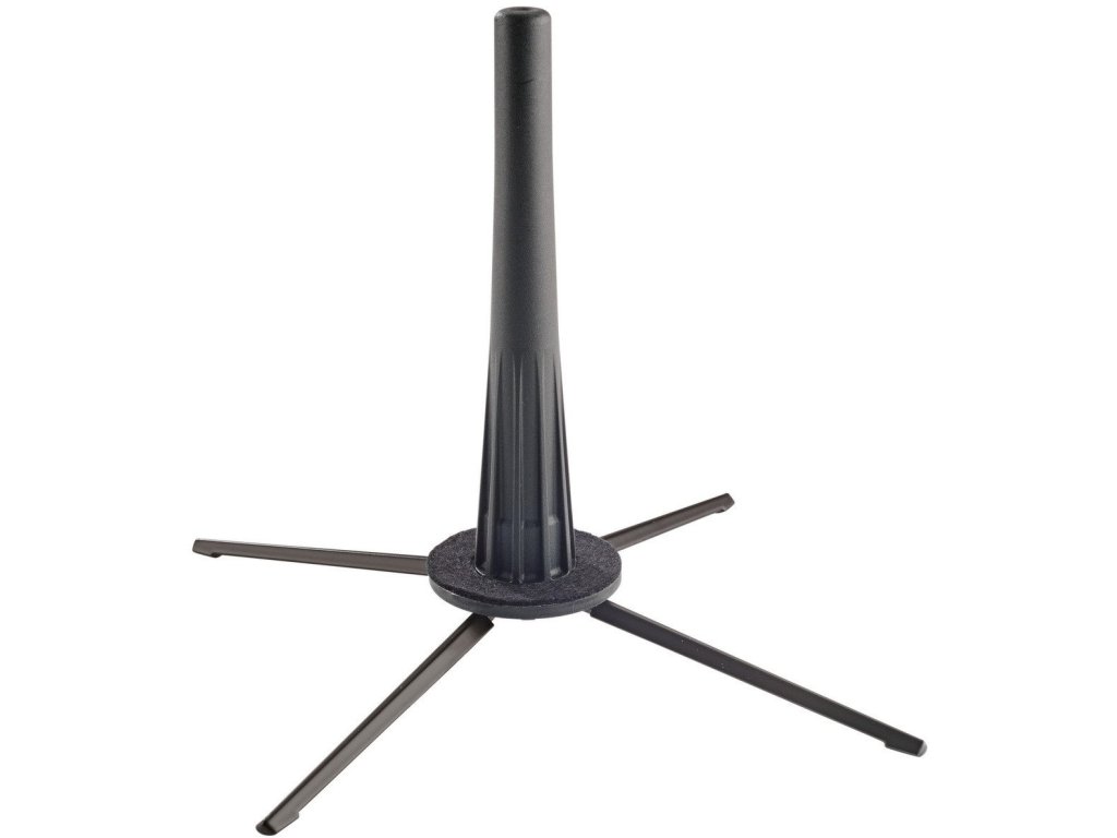 Praktyczny stojak na rożek angielski. 4 stabilne metalowe nóżki po wykręceniu wkłada się w plastikową podstawę/kołek. Miękki filcowy pierścień chroni instrument przed zarysowaniami. Wysokość 186 mm. Produkowany w kolorze czarnym.