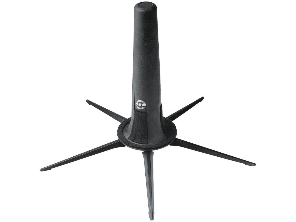 Składany statyw do saksofonu sopranowego. 5 stabilnych metalowych nóżek po wykręceniu wkłada się do plastikowej podstawy/kołka. Złożony stojak można przenosić wewnątrz instrumentu. Plastikowa podstawa jest wyposażona w filcową podkładkę chroniącą powierzchnię instrumentu. Wysokość 250 mm. Waga 0,33 kg. Produkowany w kolorze czarnym.