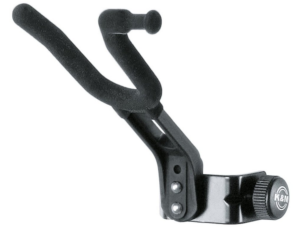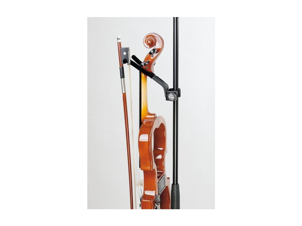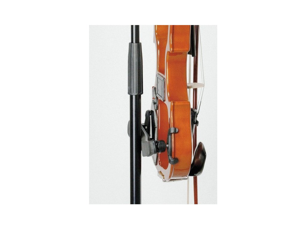Uchwyt na skrzypce do montażu na statywie mikrofonowym o średnicy 30 mm. Uchwyt jest pokryty warstwą ochronną, która zapobiega uszkodzeniom instrumentu. Posiada zintegrowany uchwyt do zawieszania smyczka. Produkowany w kolorze czarnym.