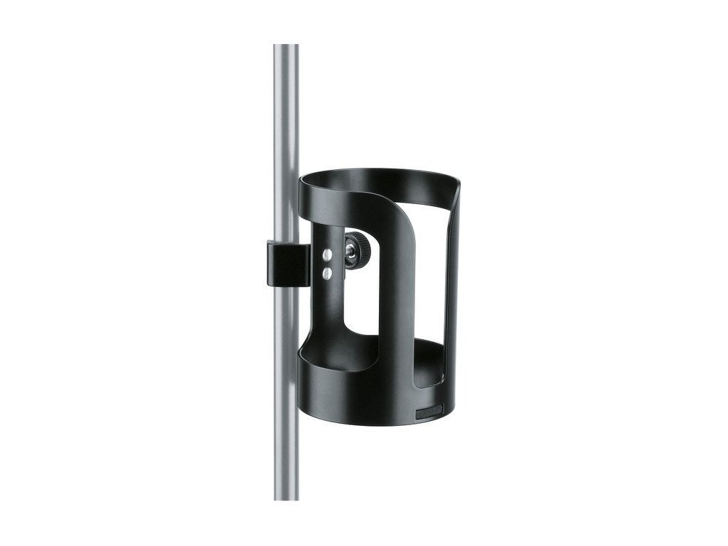 Uniwersalny stalowy uchwyt na napoje o maksymalnej średnicy do 95 mm. Mocowany do statywu o średnicy do 30 mm. Produkowany w kolorze czarnym.