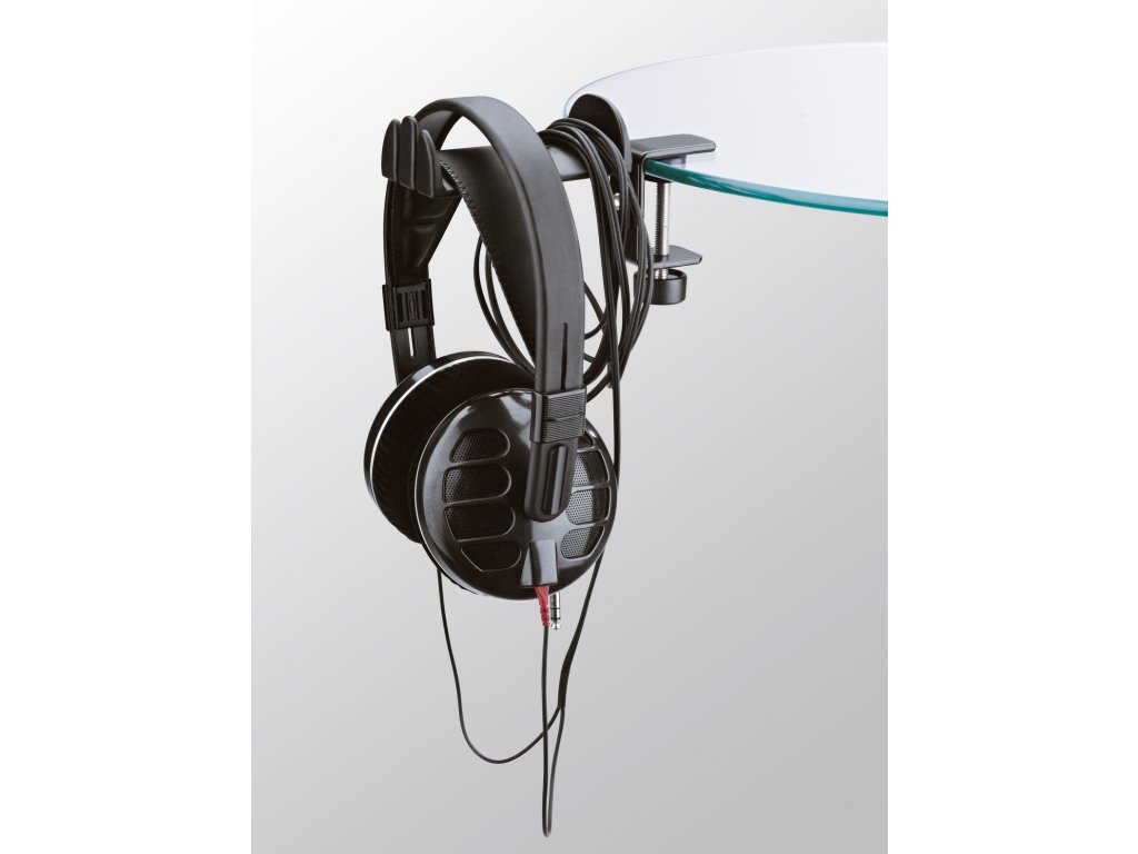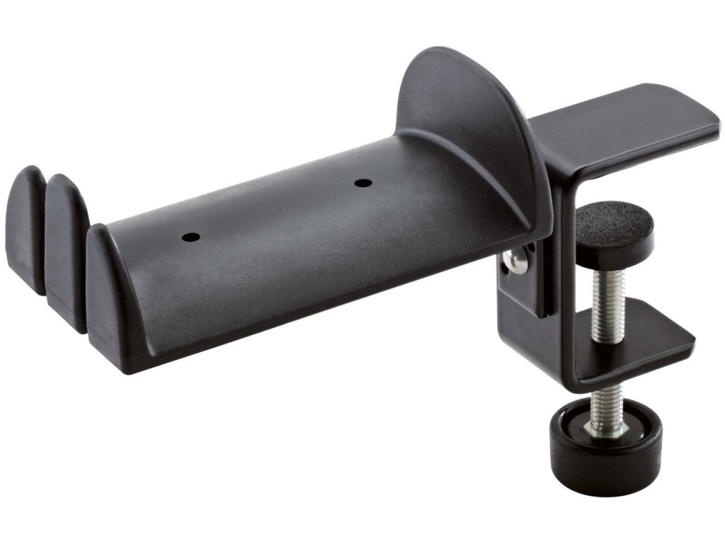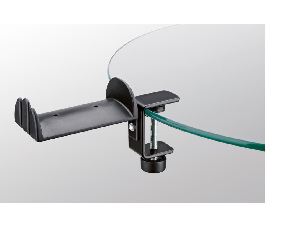 Stabilny uchwyt na 2 szt. standardowych słuchawek i 2 szt. słuchawek dousznych do przymocowania do stołu lub półki. Zakres mocowania zacisku 0 - 45 mm. Powierzchnia gumowana. Produkowany w kolorze czarnym.