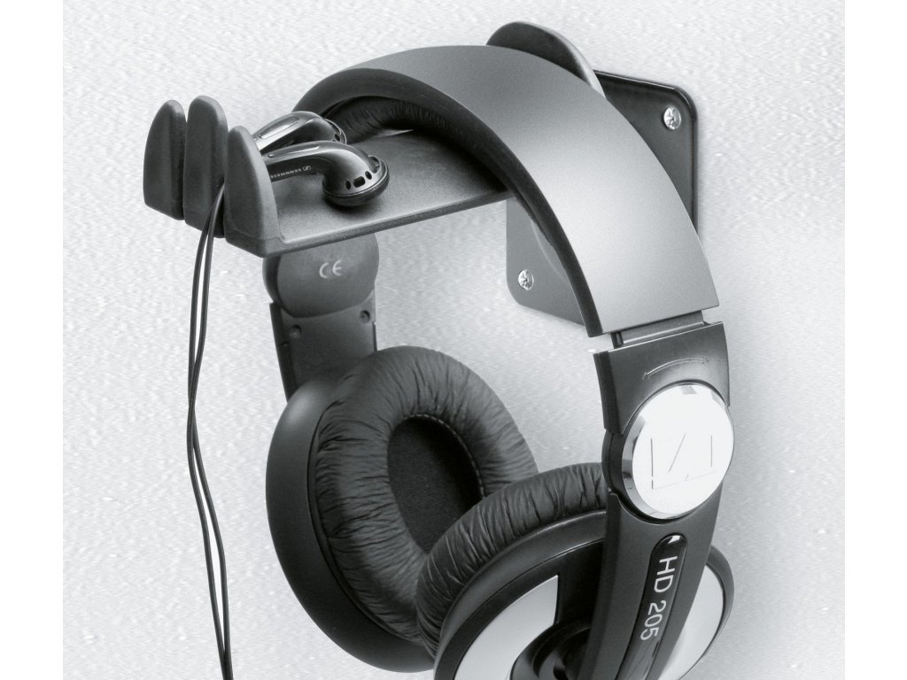 Ścienny uchwyt na słuchawki. Na gumowanym uchwycie można zawiesić 2 pary klasycznych słuchawek, a w części szczelinowej 2 pary słuchawek dousznych. Wymiary 60 x 100 mm. Uchwyt mocuje się do ściany za pomocą metalowej płytki z czterema otworami. Produkowany w kolorze czarnym.