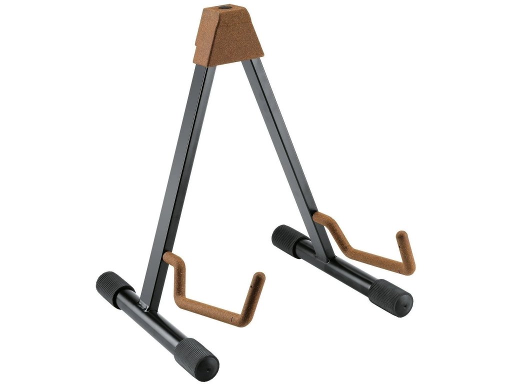 Solidny stalowy stojak na gitarę akustyczną. Metalowa składana konstrukcja, gumowane ramiona nośne chroniące powierzchnię gitary. Wysokość stojaka 420 mm. Regulacja szerokości od 220 do 350 mm. Dostępny w kolorze czarnym i korkowym.