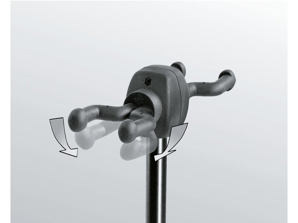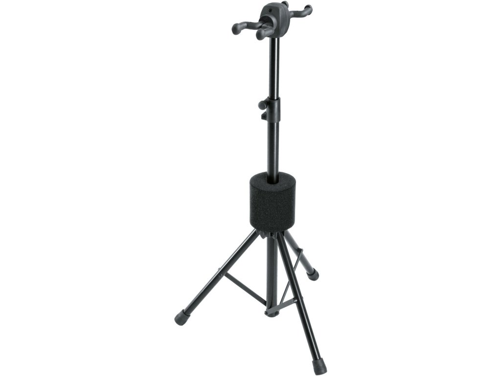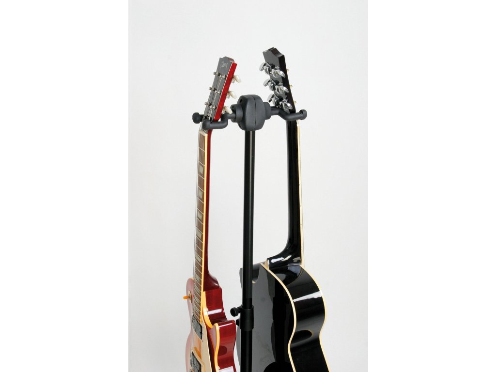 Stojak na 2 gitary »Double«. Nadaje się do gitar akustycznych, elektrycznych lub basowych, banjo i ukulele. Opatentowany system zapewnia mocne i bezpieczne mocowanie gitary. Miękka pianka i wysokiej jakości gumowanie chronią lakier w miejscach, gdzie dochodzi do kontaktu z instrumentem. Wysokość stojaka 800/1300 mm. Stojak szybko i łatwo się składa, wymiary transportowe 750 x 260 mm. Produkowany w kolorze czarnym.