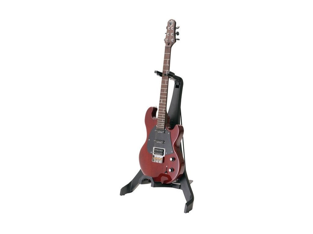 Unikalny stojak gitarowy »Carlos« o konstrukcji A, przeznaczony do gitar akustycznych i elektrycznych. Wytrzymała konstrukcja z tworzywa sztucznego zapewnia funkcjonalność i stabilność. Stojak można łatwo złożyć i transportować. Ramiona nośne z miękkimi podkładkami filcowymi chronią dolną część gitary przed zarysowaniami i uszkodzeniami. Stojak jest odpowiedni do wszystkich rodzajów lakierów, w tym nitrocelulozowych. Funkcjonalna blokada szyjki zapewnia bezpieczne trzymanie gitary. Produkowany w kolorze czarnym.