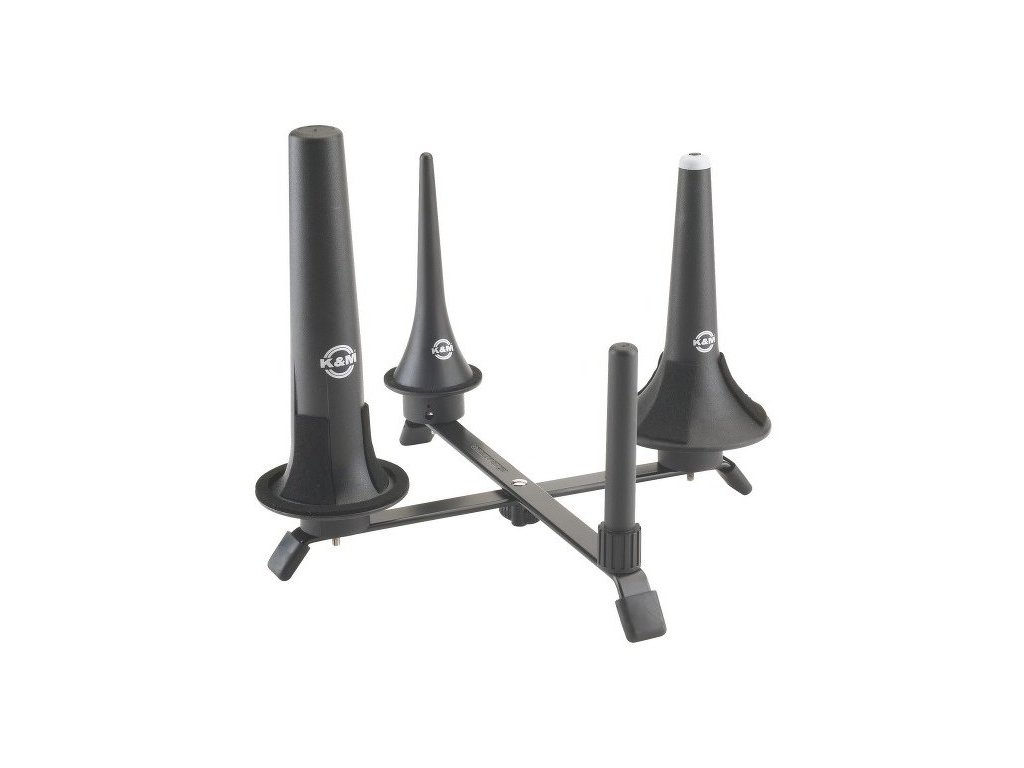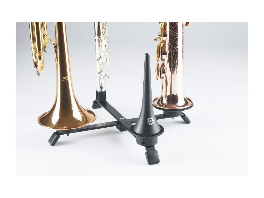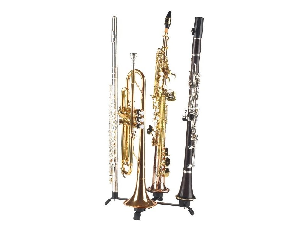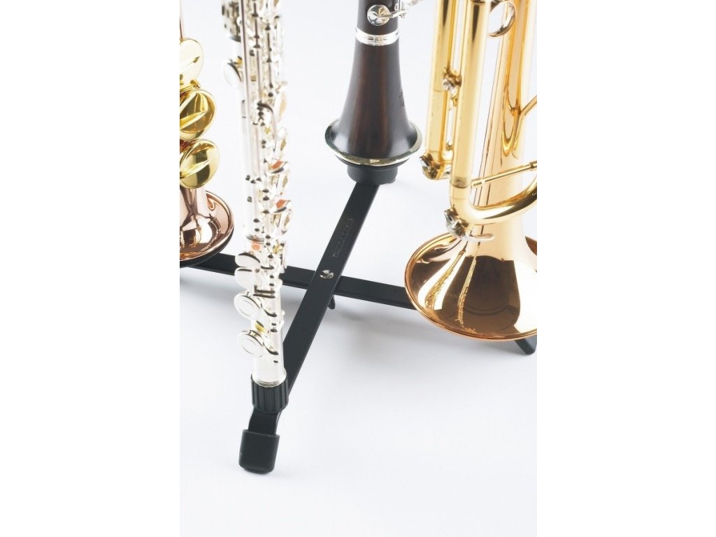 Podłogowy, składany, stalowy, krzyżowy statyw na 4 trzpienie do instrumentów dętych. Gumowane końcówki chronią podłogę przed zarysowaniami. Produkowany w kolorze czarnym.