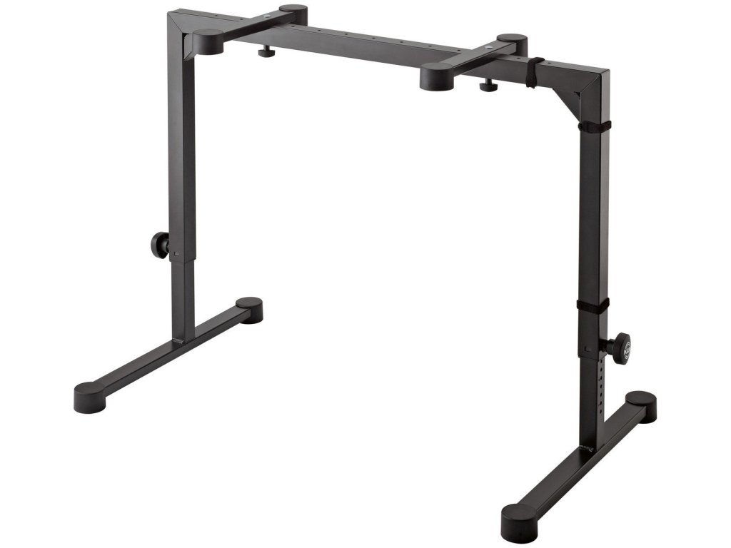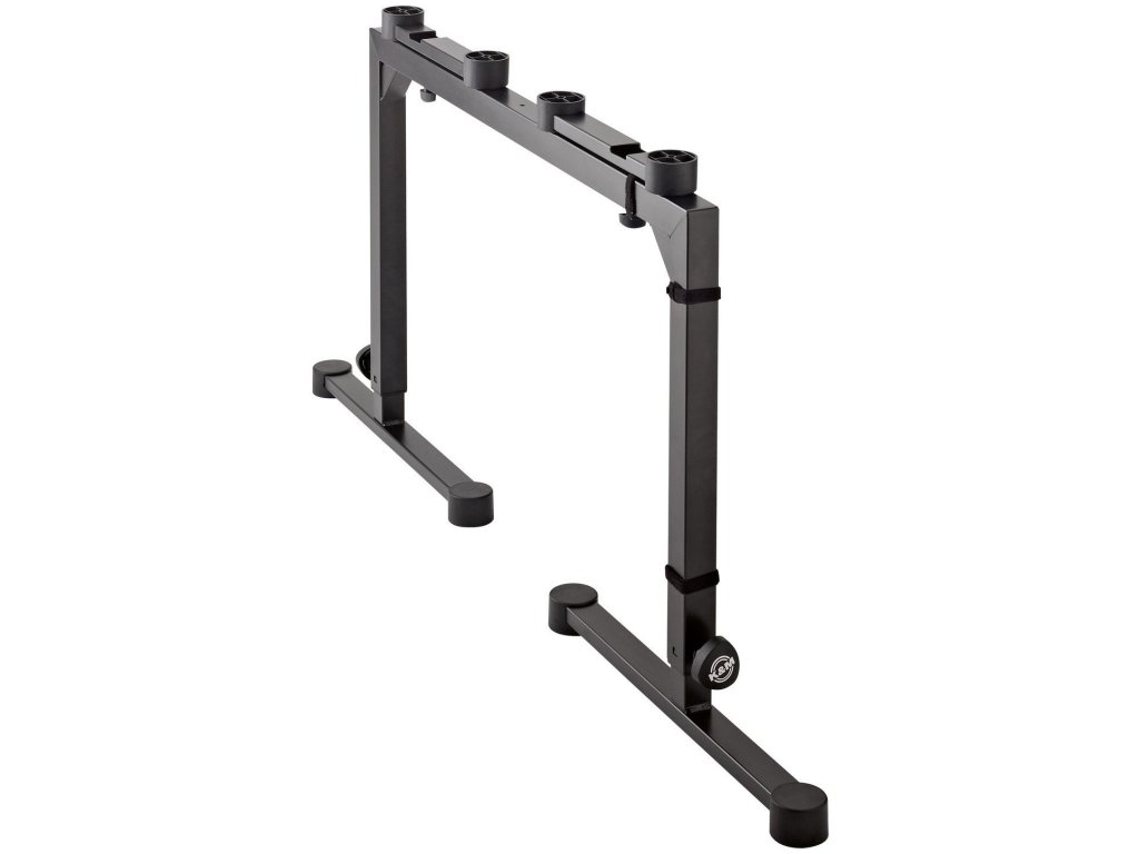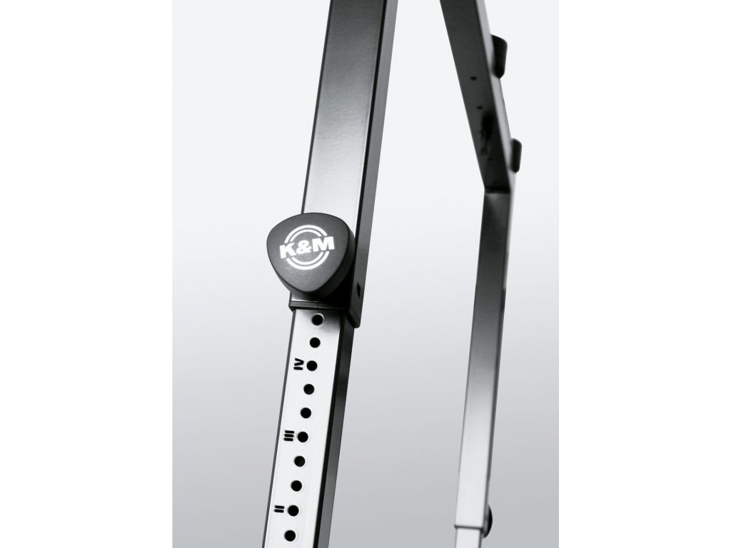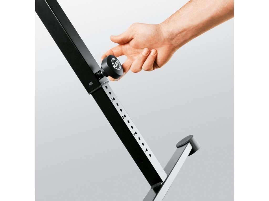 Stojak na keyboard »Omega« o kompaktowej stalowej konstrukcji. Nośność 80 kg. Duże, okrągłe osłony podłogowe zapewniają dużą stabilność stojaka. Łatwa i precyzyjna regulacja wysokości za pomocą dwóch śrub mocujących. Regulacja ramion nośnych w zależności od wielkości klawiszy. Do stojaka można przymocować nasadkę na dodatkowe keyboardy 18811, adapter do ramienia mikrofonowego 18814, uchwyt na nuty 18958, uchwyt na iPada 18816 lub uniwersalny uchwyt 18817. Stojak posiada 4 paski Velcro do prowadzenia kabli. Produkowany jest w kolorze czarnym, białym i czerwonym.