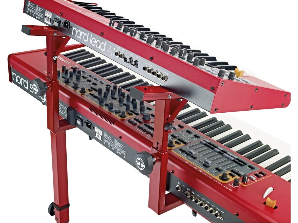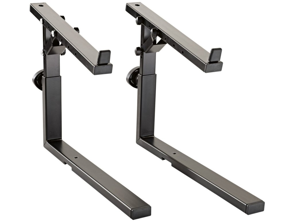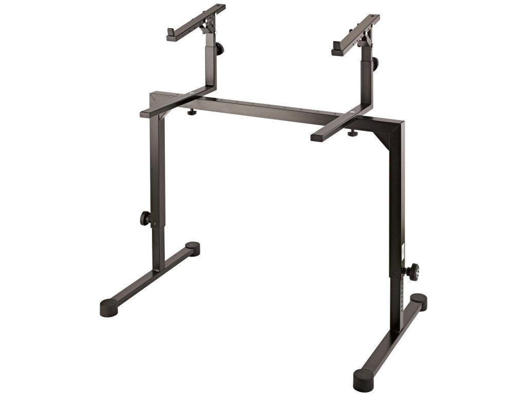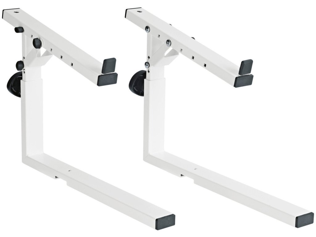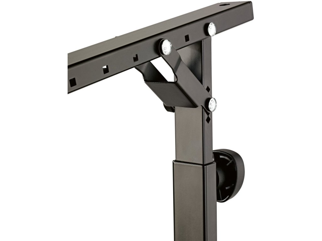 Stalowy dodatkowy uchwyt na klawisze lub notebook do statywu 18810 »Omega«. Większe klawisze można umieścić w dolnej części. Głębokość górnych ramion można ustawić w 4 pozycjach, dzięki czemu dolne klawisze będą nadal widoczne. Możliwość ustawienia 10 różnych poziomów wysokości. Ramiona nośne można nachylić w 5 różnych pozycjach od 0° do 20°. Wysokość 262/375 mm. Nośność 25 kg. Samoprzylepne gumowe podkładki chroniące przed zarysowaniem i poślizgiem instrumentu. Po zdjęciu tylnej pokrywy można wsunąć nasadkę 18821 na trzeci klawisz. Występuje w kolorze czarnym, białym i czerwonym.