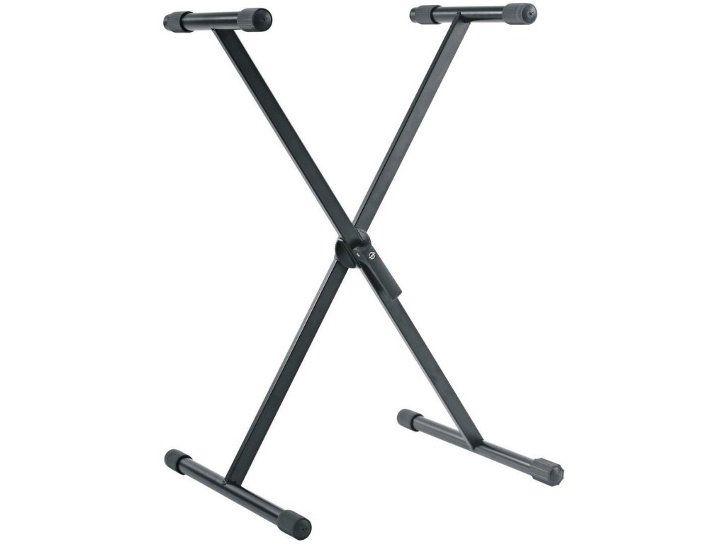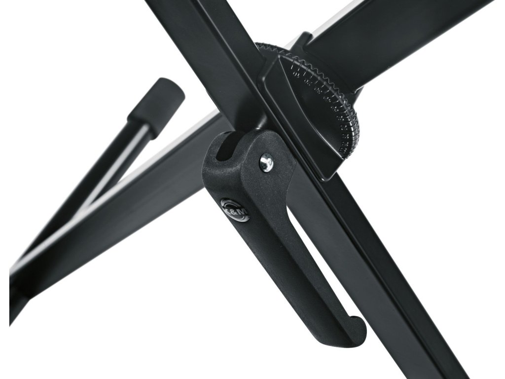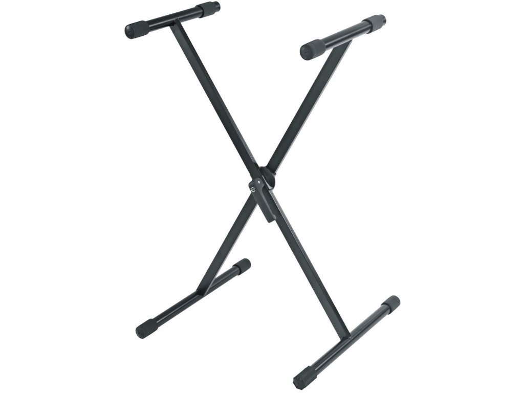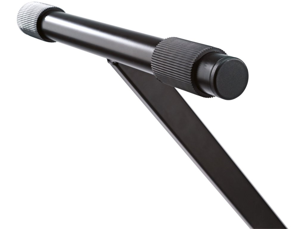 Komfortowy, stalowy statyw X na keyboard. Ergonomiczny mechanizm zaciskowy umożliwia szybkie i łatwe rozkładanie i regulację. Wytrzymały metalowy przegub można regulować w 5-stopniowych odstępach, co pozwala na wykorzystanie szerokiej gamy pozycji. Antypoślizgowe gumowe końcówki można regulować w zależności od szerokości klawiszy. Wysokość statywu: 594/964 mm. Szerokość 327/789 mm. Maksymalna głębokość 250 mm. Nośność 50 kg. Produkowany w kolorze czarnym.
