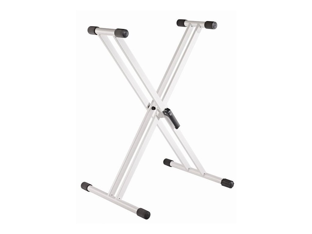 Komfortowy i niezwykle wytrzymały stalowy statyw klawiszowy X »Rick 20«. Ergonomiczny mechanizm zaciskowy umożliwia szybkie i łatwe rozkładanie i regulację. Wytrzymały metalowy przegub można regulować w 5-stopniowych odstępach, co pozwala na wykorzystanie szerokiej gamy pozycji. Cztery antypoślizgowe gumowe końcówki i głębokość 250 mm umożliwiają użycie statywu do wszystkich typów klawiszy. Wysokość 594/946 mm. Szerokość 327/789 mm. Nośność 50 kg. Dostępny w kolorze czarnym i białym.