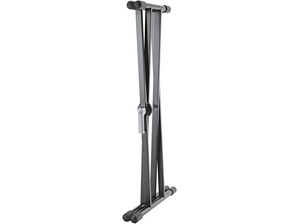 Wyjątkowo lekki i stabilny aluminiowy statyw klawiszowy typu X. Ergonomiczny mechanizm zaciskowy umożliwia szybkie i łatwe rozkładanie i regulację. Wytrzymały metalowy przegub można regulować w 5-stopniowych odstępach, co pozwala na wykorzystanie szerokiej gamy pozycji. Antypoślizgowe gumowe końcówki można regulować w zależności od szerokości klawiszy. Wysokość statywu 594/946 mm. Szerokość 327/789 mm. Maksymalna głębokość: 350 mm. Nośność 50 kg. Produkowany w kolorze czarnym.