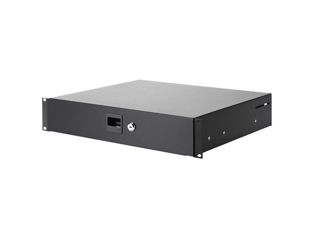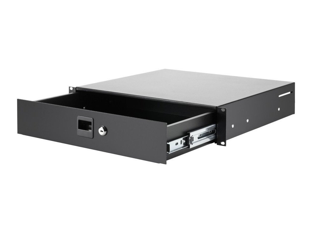 Zamykany moduł szufladowy do szafy rack 19". Pełny wysuw szuflady na prowadnicach kulkowych. Szuflada na kulkowej listwie wsuwanej. W zestawie zamek cylindryczny i 2 klucze. Ze sprzęgłem na wysuwie szuflady, które umożliwia wyjęcie.