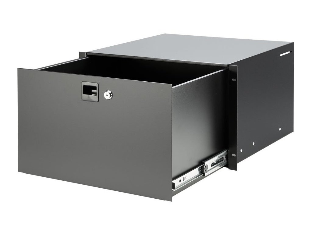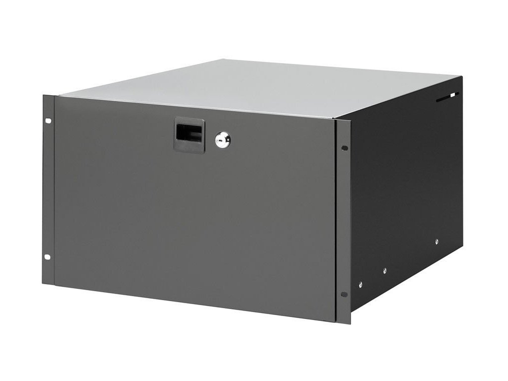 Zamykany moduł szufladowy do szafy rack 19". Pełny wysuw szuflady na prowadnicach kulkowych. Szuflada na kulkowej listwie wsuwanej. W zestawie zamek cylindryczny i 2 klucze. Ze sprzęgłem na wysuwie szuflady, które umożliwia wyjęcie.
