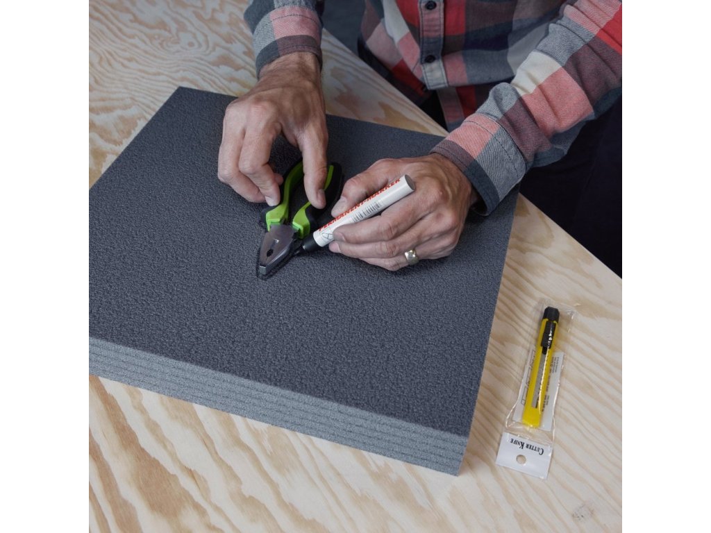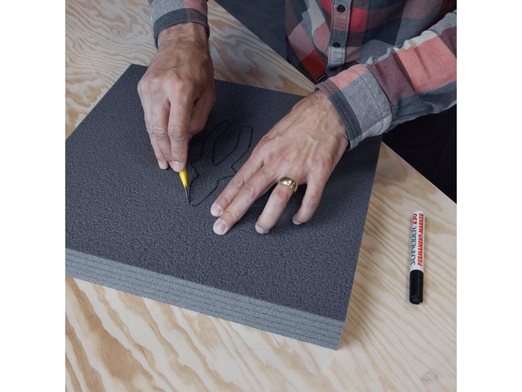 Aby uzyskać idealne wymiary, wystarczy położyć element na piance i odrysować kontur na piance markerem. Ostrożnie przecinaj piankę wzdłuż konturu za pomocą noża. Upewnij się, że przecinasz tylko wymagane warstwy.