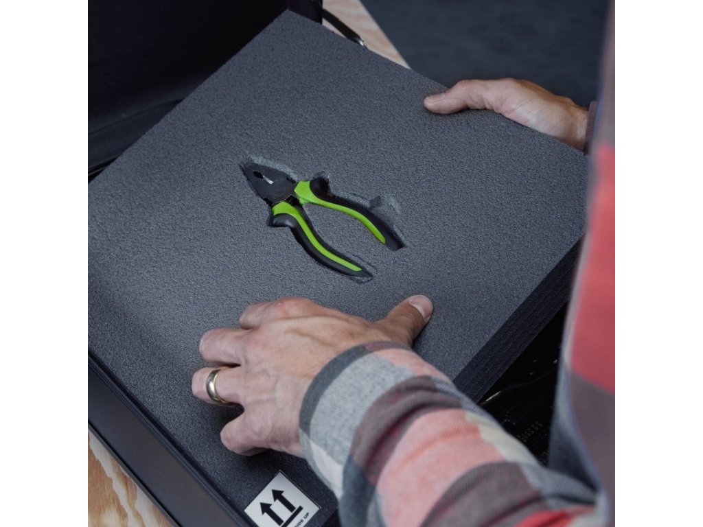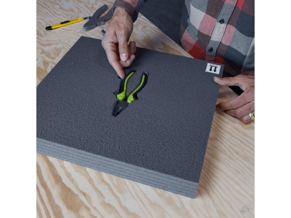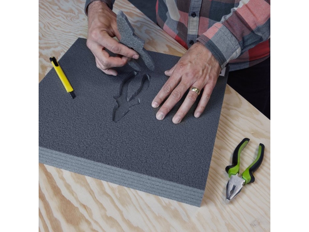 Do stworzenia własnej wnęki wystarczy ostry nóż. Genialność pianki Kyoto polega na tym, że składa się z 5 warstw, które są do siebie mocno przyklejone, ale można je od siebie oddzielić bez pozostawiania resztek kleju na głównej części. Umożliwia to różne poziomy głębokości cięcia i nie wymaga maszyny CNC.
