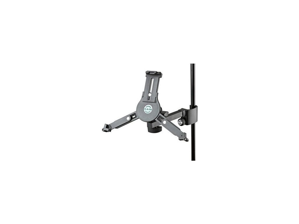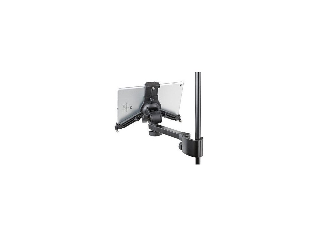 Uniwersalny uchwyt do tabletu/iPada z łatwym i szybkim mocowaniem do dowolnego statywu o średnicy do 30 mm. Zastosowanie na scenie, w sali prób i w warunkach domowych. Do tabletów i iPadów o wysokości 220/331 mm i szerokości 128/232 mm (np. iPad, iPad Air, iPad Pro, Amazon Fire HDX 8.9, Samsung Galaxy Tab 9.7, Google Nexus 9, Asus Transformer lub Microsoft Surface i Surface Pro). Głębokość tabletu może wynosić od 5 do 11 mm. Regulacja kąta nachylenia, możliwość płynnej regulacji do pozycji poziomej i pionowej. Produkowany w kolorze czarnym.