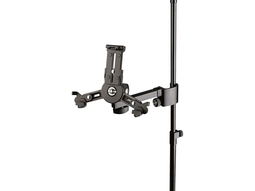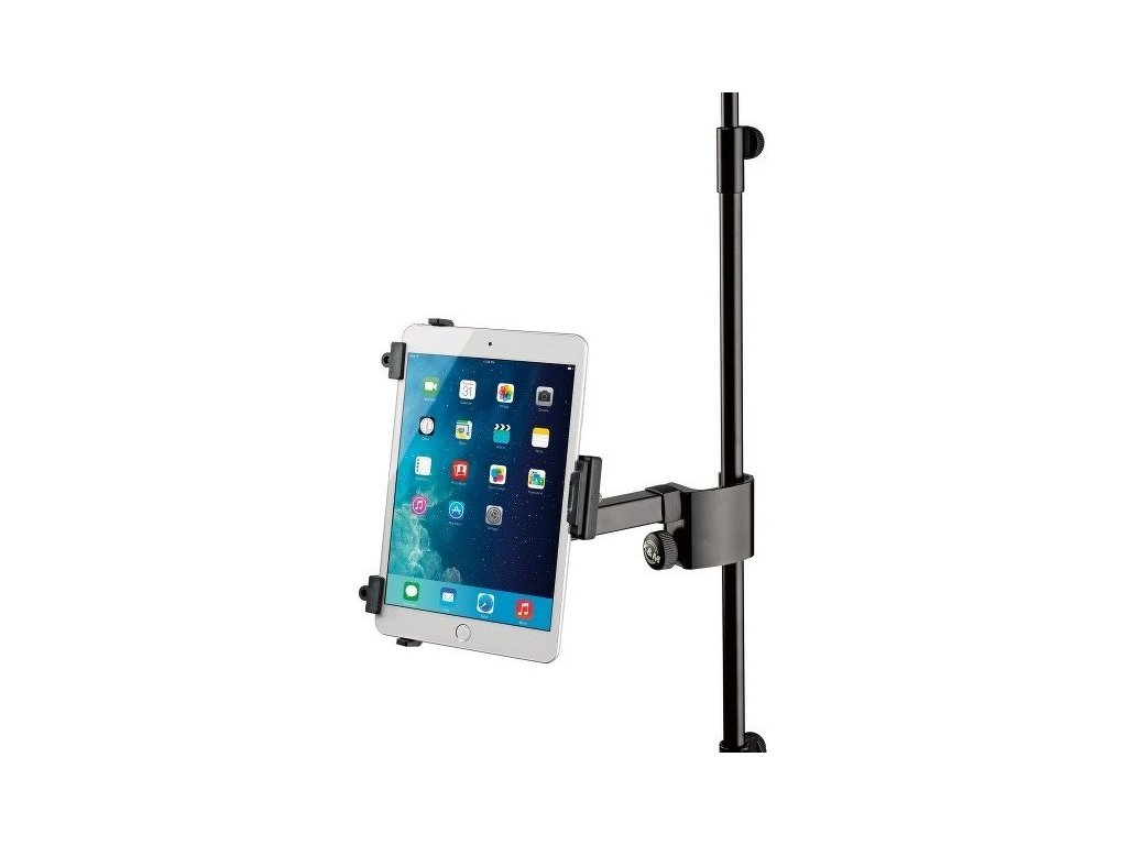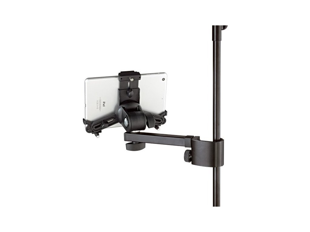 Uniwersalny uchwyt na tablet do użytku w studio, na scenie lub w domu. Można go łatwo przymocować do dowolnego statywu o średnicy rury do 30 mm. Indywidualnie regulowane ramiona podtrzymujące do tabletu o wysokości 163/242 mm i szerokości 102/189 mm (na przykład iPad mini, iPad Pro 9.7, Amazon Fire HDX 8.9, Google Nexus 9). Głębokość tabletu 5/11 mm. Przy pierwszym użyciu uchwytu tabletu regulacja ramienia podtrzymującego odbywa się poprzez ustawienie śrub mocujących na wielkość i głębokość tabletu. Do innych zastosowań tablet można szybko i łatwo przymocować i odłączyć za pomocą zatrzasku. Alternatywnie można go przykręcić do gwintu 3/8". Produkowany w kolorze czarnym.