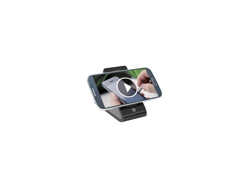Elegancki uniwersalny stojak na smartfon wykonany z czarnego szkła akrylowego o wysokim połysku. Wymiary podstawki: 75 x 50 x 85 mm. Mocowanie smartfona na lepkich podkładkach bez klejów i magnesów. Podkładki można łatwo czyścić wodą. Smartfon można umieścić w pozycji poziomej i pionowej. Kąt nachylenia stojaka wynosi 45° dla komfortowego przeglądania zdjęć, filmów, surfowania i pisania. Na spodzie stojaka znajdują się dwie podkładki antypoślizgowe. Produkowany w kolorze czarnym.