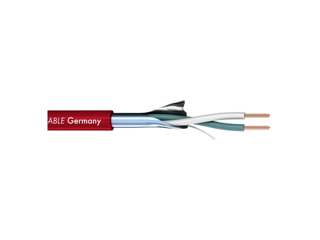 Symetryczny kabel instalacyjny, wysokiej jakości miedź OFC, przekroje żył 2 x 0,22 mm, 100% ekranowanie folią AL/PT, przekrój PVC 3,3 mm. Zakres temperatur pracy od -25° C do + 70° C, waga 1 m 16 g, kolor czerwony.