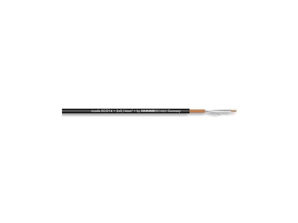 CICADA SO-D14 to niezwykle cienki symetryczny kabel instalacyjny wykonany z wysokiej jakości miedzi OFC i powłoki PUR. Przekroje żyły 2 x 0,14 mm, 95% ekranowanie miedziane, przekrój płaszcza PUR 2,6 mm, zakres temperatur pracy od -30°C do +70°C, waga 1m 13 g, kolor czarny.