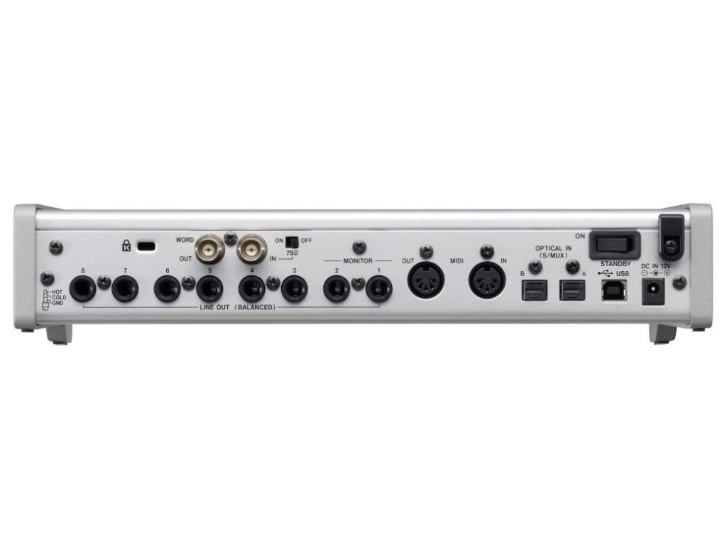 Przedwzmacniacze mikrofonowe Tascam Ultra-HDDA, dźwięki o wysokiej rozdzielczości. Cztery analogowe wejścia mikrofonowe są wyposażone w niskoszumowe przedwzmacniacze mikrofonowe Ultra-HDDA i indywidualnie przełączane zasilanie phantom (+48 V). Przy użyciu dwóch wielokanałowych portów optycznych, które mogą odbierać do 16 kanałów wejść audio z urządzeń kompatybilnych z ADAT lub S / MUX, dostępnych jest maksymalnie 20 wejść (osiem przy 192 kHz). Osiem zbalansowanych liniowych wyjść jack 6,3 mm umożliwia wielokrotny miks monitorów lub do 7.1 monitorowania dźwięku przestrzennego, a także dwa wyjścia słuchawkowe z dedykowanym poziomem sterowania. Wejście i wyjście Word Clock zapewnia prawidłową synchronizację z innymi cyfrowymi urządzeniami audio. Możesz również podłączyć swoje ulubione urządzenia MIDI do tylnego panelu wejścia i wyjścia MIDI, aby używać ich z oprogramowaniem do nagrywania.