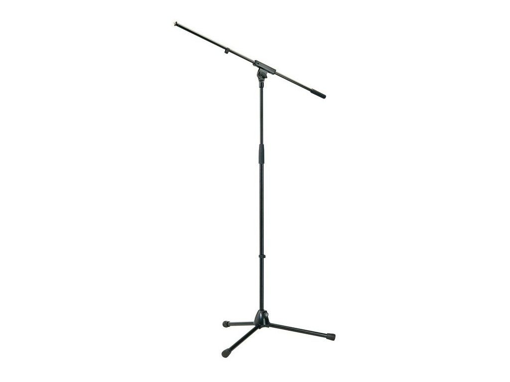 Nowoczesny statyw mikrofonowy. Podstawa z długimi składanymi nogami. Specjalny mechanizm do regulacji wysokości. Kolor czarny.