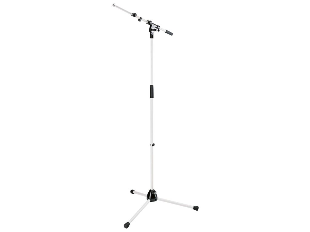 Profesjonalny statyw mikrofonowy z teleskopowym ramieniem. Trójnożna składana podstawa. Kolor biały.