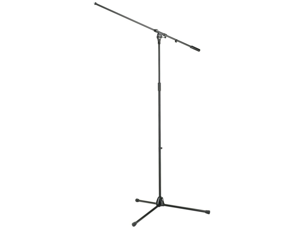 Nowoczesny statyw mikrofonowy typu overhead. Podstawa z długimi składanymi nogami. Specjalny mechanizm do regulacji wysokości. Kolor czarny.