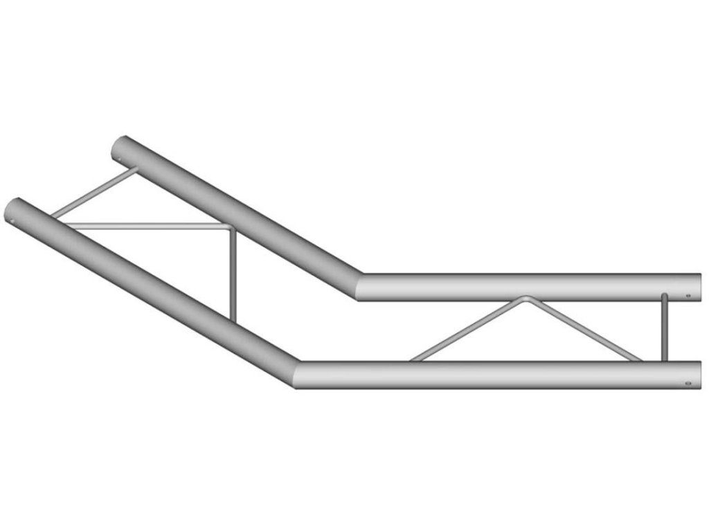 Narożny element konstrukcyjny umożliwiający budowę konstrukcji scenicznych do zawieszania instalacji oświetleniowych lub dźwiękowych. Element jest zagięty poziomo pod kątem 135° i wykonany z pary prętów o średnicy 35 mm i grubości ścianek 2 mm. Konstrukcja wykonana jest ze stopu AlMgSi1, dzięki czemu każdy z elementów serii DT22 zachowuje niską wagę i wysoką wytrzymałość. Pręty wzmacniające mają średnicę 8 mm. Element jest wyposażony w końcówki do zasilania kolejnych elementów. Opakowanie zawiera również śruby i klipsy zabezpieczające. Wymiary: 500 x 500 x 35 mm, waga: 1,9 kg.