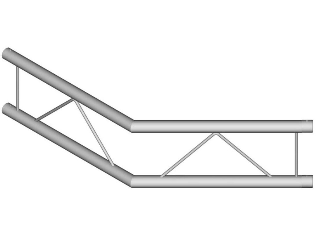 Narożny element konstrukcyjny umożliwiający budowę konstrukcji scenicznych do zawieszania instalacji oświetleniowych lub dźwiękowych. Element jest wygięty pionowo pod kątem 135° i wykonany z pary prętów o średnicy 35 mm i grubości ścianek 2 mm. Konstrukcja wykonana jest ze stopu AlMgSi1, dzięki czemu każdy z elementów serii DT22 zachowuje niską wagę i wysoką wytrzymałość. Pręty wzmacniające mają średnicę 8 mm. Element jest wyposażony w końcówki do zasilania kolejnych elementów. Opakowanie zawiera również śruby i klipsy zabezpieczające. Wymiary: 500 x 500 x 220 mm, waga: 2,1 kg.