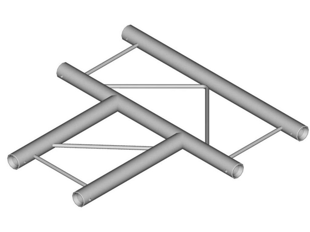 Narożny element konstrukcyjny umożliwiający budowę konstrukcji scenicznych do zawieszania instalacji oświetleniowych lub dźwiękowych. Element jest zagięty poziomo pod kątem 90° w kształcie litery T i wykonany z dwóch prętów o średnicy 35 mm i grubości ścianki 2 mm. Konstrukcja wykonana jest ze stopu AlMgSi1, dzięki czemu każdy z elementów serii DT22 zachowuje niską wagę i wysoką wytrzymałość. Pręty wzmacniające mają średnicę 8 mm. Element jest wyposażony w końcówki do zasilania kolejnych elementów. W zestawie znajdują się również śruby i klamry zabezpieczające. Wymiary: 500 x 500 x 35 mm, waga: 1,7 kg.