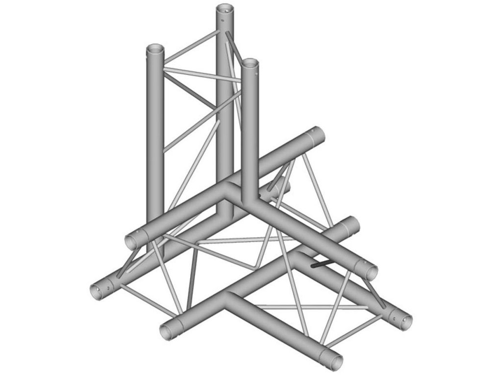 Czterokierunkowe, dolne złącze T ze wzmocnieniami poprzecznymi, do konstrukcji scenicznej. Ma kąt 90°, jest wykonany ze stopu EN-AW 6060 T66, ma średnicę prętów nośnych 35 mm x 2 mm i średnicę wzmocnień 8 mm. Ma możliwość wykończenia powierzchni farbą proszkową, we wszystkich odcieniach RAL. Wymiary: 500 x 500 x 550 mm. Waga: 3 kg.