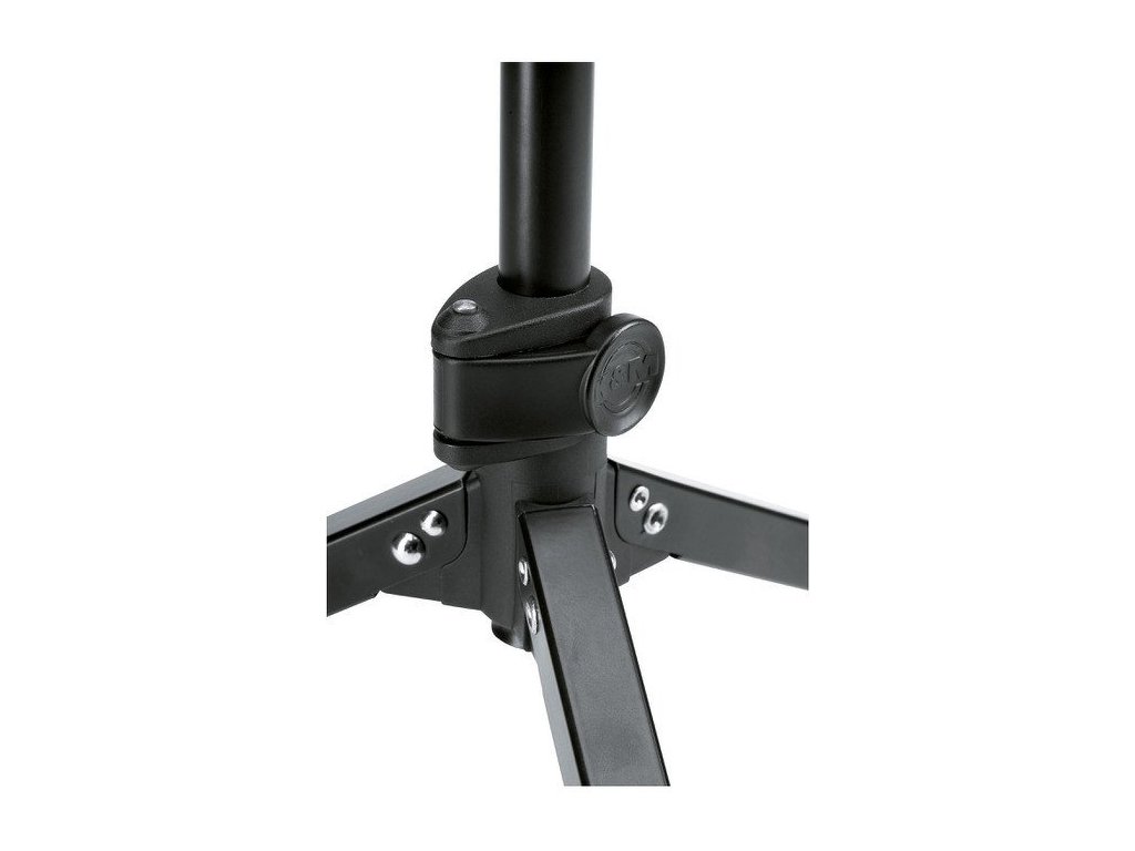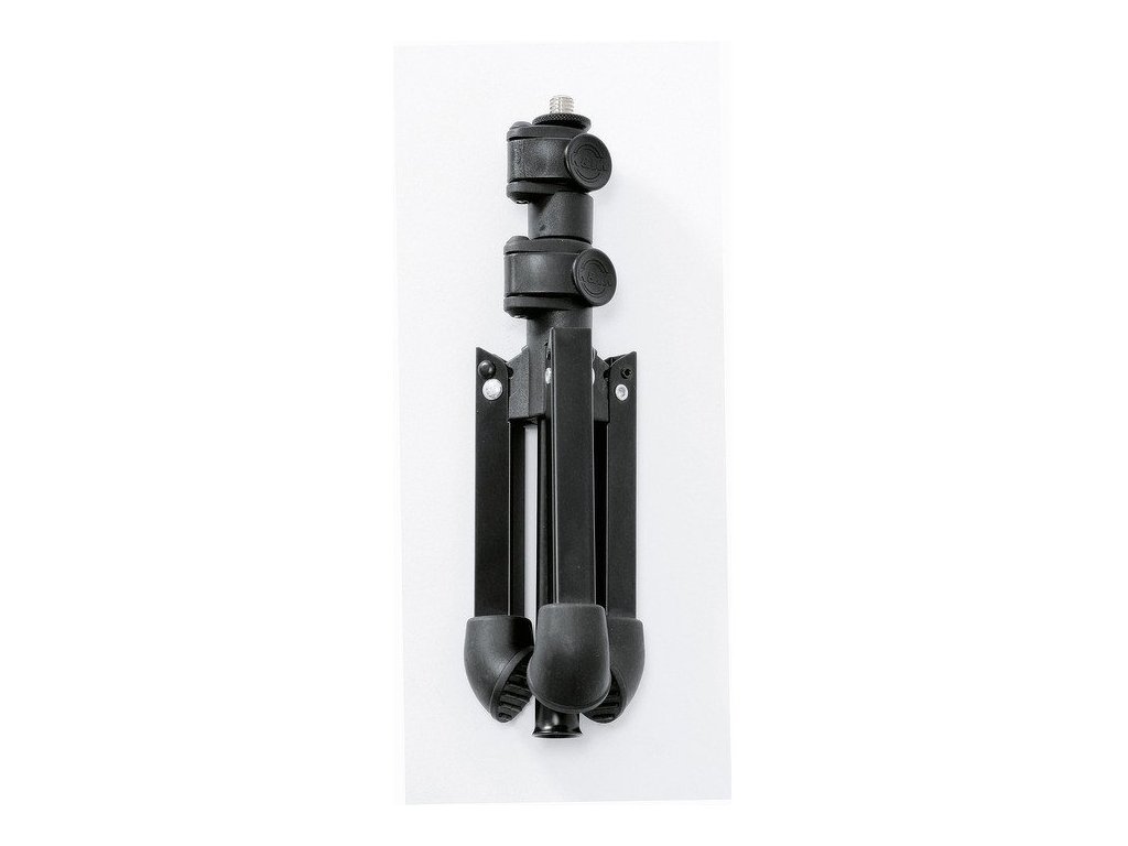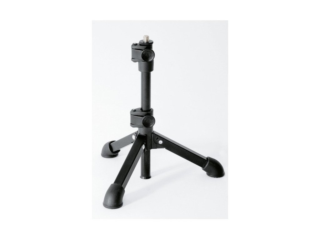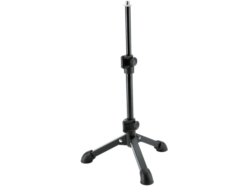 Stojak mikrofonowy stołowy, wysuwany. Lekki i stabilny z trzema składanymi nóżkami. Wysokość stojaka 230/430 mm. Produkowany w kolorze czarnym.