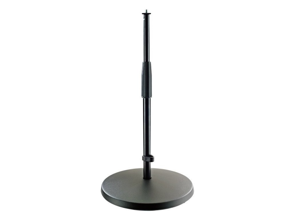 Średniej wysokości statyw mikrofonowy ze stabilną podstawą żeliwną. Nadaje się do nagrywania perkusji, instrumentów smyczkowych lub wzmacniaczy gitarowych i basowych. Żeliwna podstawa o średnicy 250 mm posiada antywibracyjną gumową wkładkę. Wysokość 350/570 mm. Produkowany w kolorze czarnym.